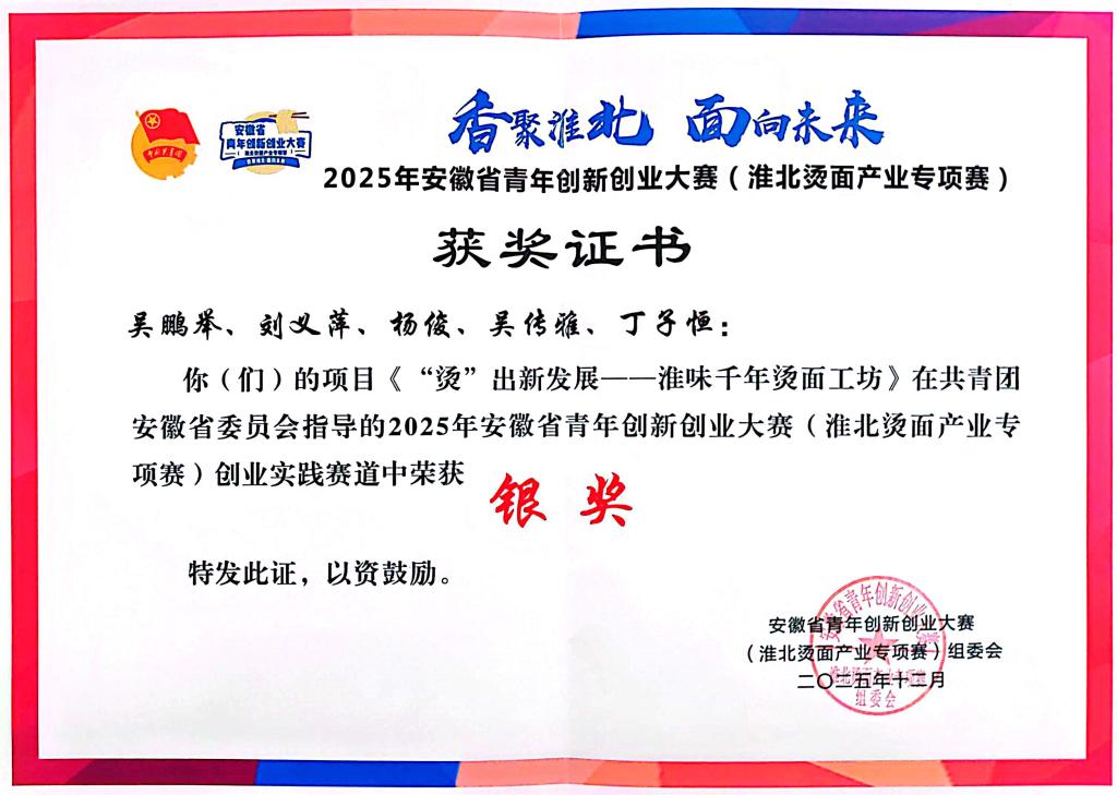 由吴鹏举同学主持的银奖项目《“烫”出新发展——淮味千年烫面工坊》,聚焦创业实践赛道,围绕烫面产业全链条设计了集”传统工艺传承+标准化生产+品牌化运营”于一体的工坊模式,既保留了淮北烫面的地道风味,又通过供应链优化、线上线下渠道联动,为小餐饮品类的规模化发展提供了可落地的方案。