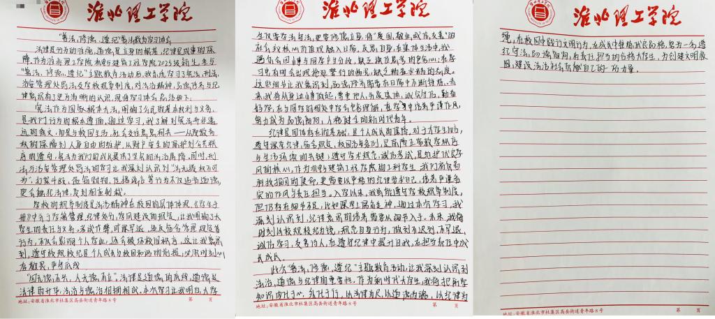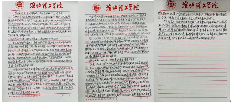 在自主学习阶段,同学们认真研读法律条文与校规校纪,结合自身成长经历和大学生活规划,梳理知识点、记录学习感悟。不少同学表示,此次自主学习让自己对法律的严肃性和校规的重要性有了更深刻的认识,也意识到法治素养是当代大学生不可或缺的基本素养。随后,同学们严格按照要求,撰写不少于1000字的手写学习体会,内容涵盖法律法规与校规校纪的学习总结、结合自身情况的深刻反思,以及未来遵法守纪、修身立德的具体规划。所有心得稿件均统一使用印有beat365唯一官方网站标识的信纸书写,字迹工整、卷面整洁,充分展现了机电与建筑工程学院新生的良好学风。