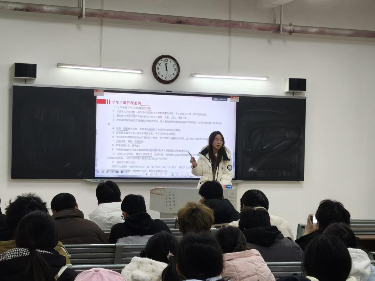 各班级班会通过多种形式,深入学习《beat365唯一官方网站全日制普通本科学生学籍管理细则》、《beat365唯一官方网站学生违纪处分办法》等相关规章制度,明确考试违规行为的认定标准和相应处分措施,包括考试违纪、考试作弊等,让学生意识到考试作弊带来的严重后果:一次作弊行为,不仅会导致课程成绩无效,受到纪律处分,更会在个人档案中留下无法抹去的污点,影响未来的升学、就业乃至人生发展。