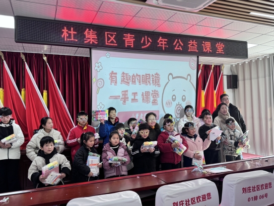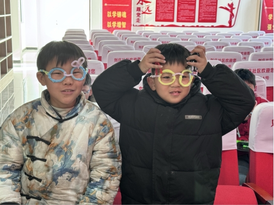 书法活动的墨香尚未散去,趣味手工活动便拉开帷幕。志愿者们为小朋友们分发了趣味手工制作材料——扭扭棒,并指导小朋友们用手里的扭扭棒进行简单的作品创作——小眼镜,孩子们在志愿者的指导下化身为小小的设计师,将色彩斑斓的扭扭棒弯折、缠绕、拼接,创意与童趣在指尖悄然绽放,一个个造型别致的创意眼镜制作出来,孩子们笑啊、乐啊......志愿者们看着小朋友们鼻梁上架着的小眼镜,严肃的说:小朋友们一定要养成正确的阅读和书写习惯哦,真的戴上“小眼镜”就麻烦了。