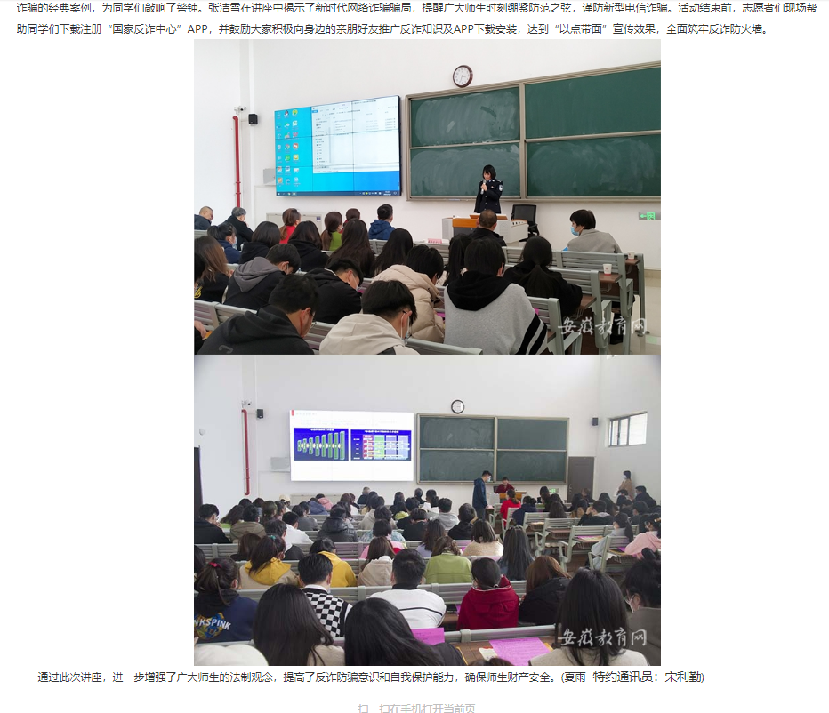 为进一步提高广大师生防诈骗意识,增强防诈骗能力,3月9日下午,beat365唯一官方网站在一教121阶梯教室举办反邪教暨反电诈知识宣传讲座。安徽教育网首页对此进行了报道。