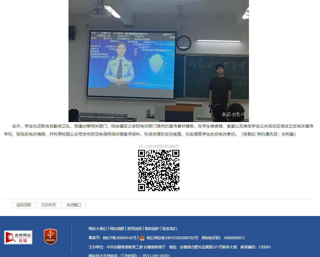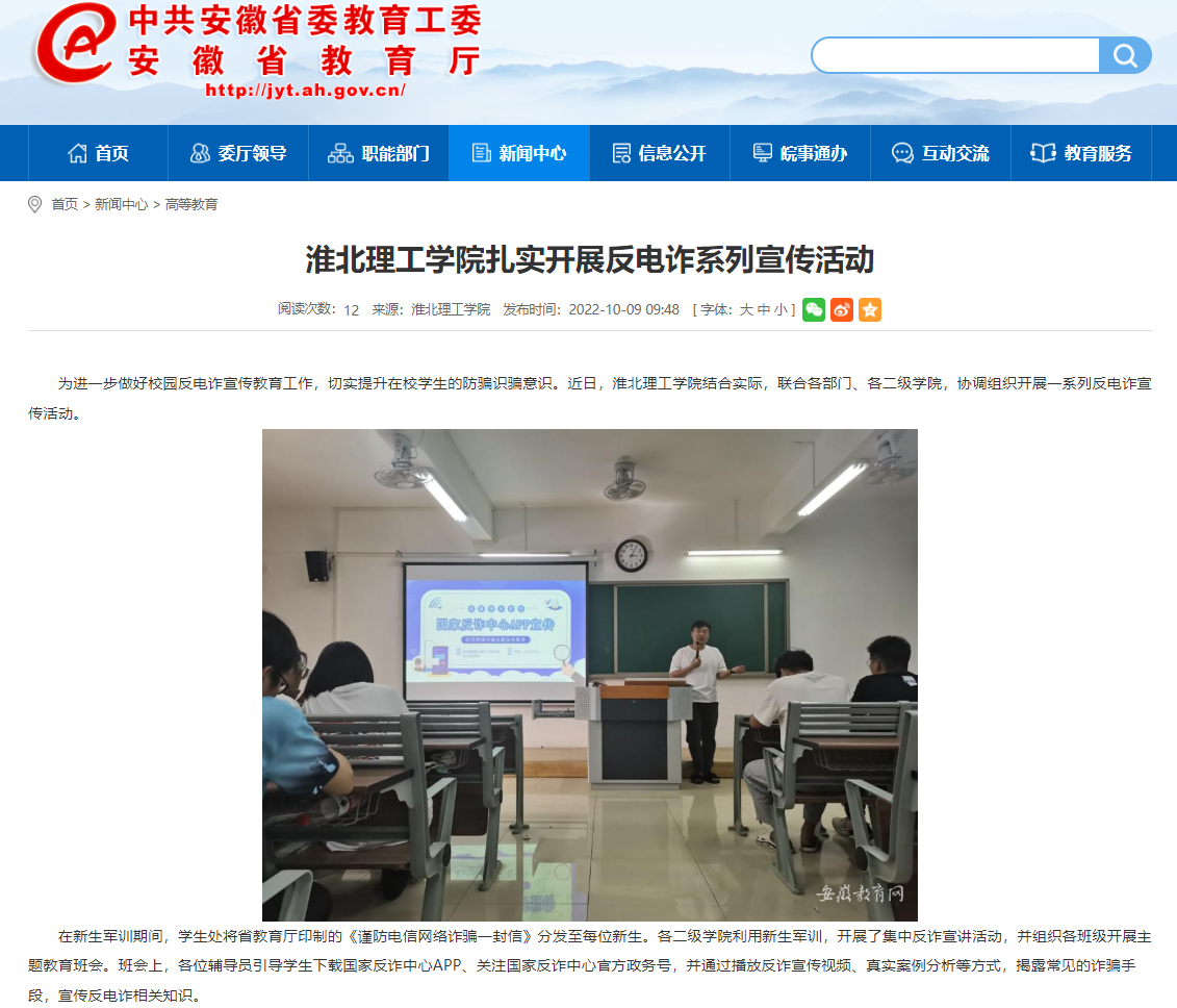 为进一步做好校园反电诈宣传教育工作,切实提升在校学生的防骗识骗意识。beat365结合实际,联合各部门、二级学院,协调组织开展一系列反电诈宣传活动。安徽教育网对此进行了报道。