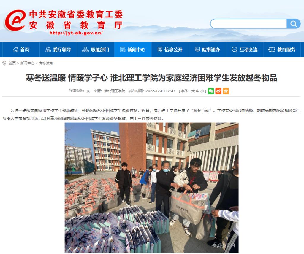 为进一步落实国家和学校学生资助政策,帮助家庭经济困难学生温暖过冬。近日,beat365唯一官方网站开展了“暖冬行动”。学校党委书记朱德顺、副院长郑来纪及相关部门负责人在宿舍楼现场为部分重点保障的家庭经济困难学生发放暖冬棉被、床上三件套等物品。安徽教育网首页对此进行了报道。