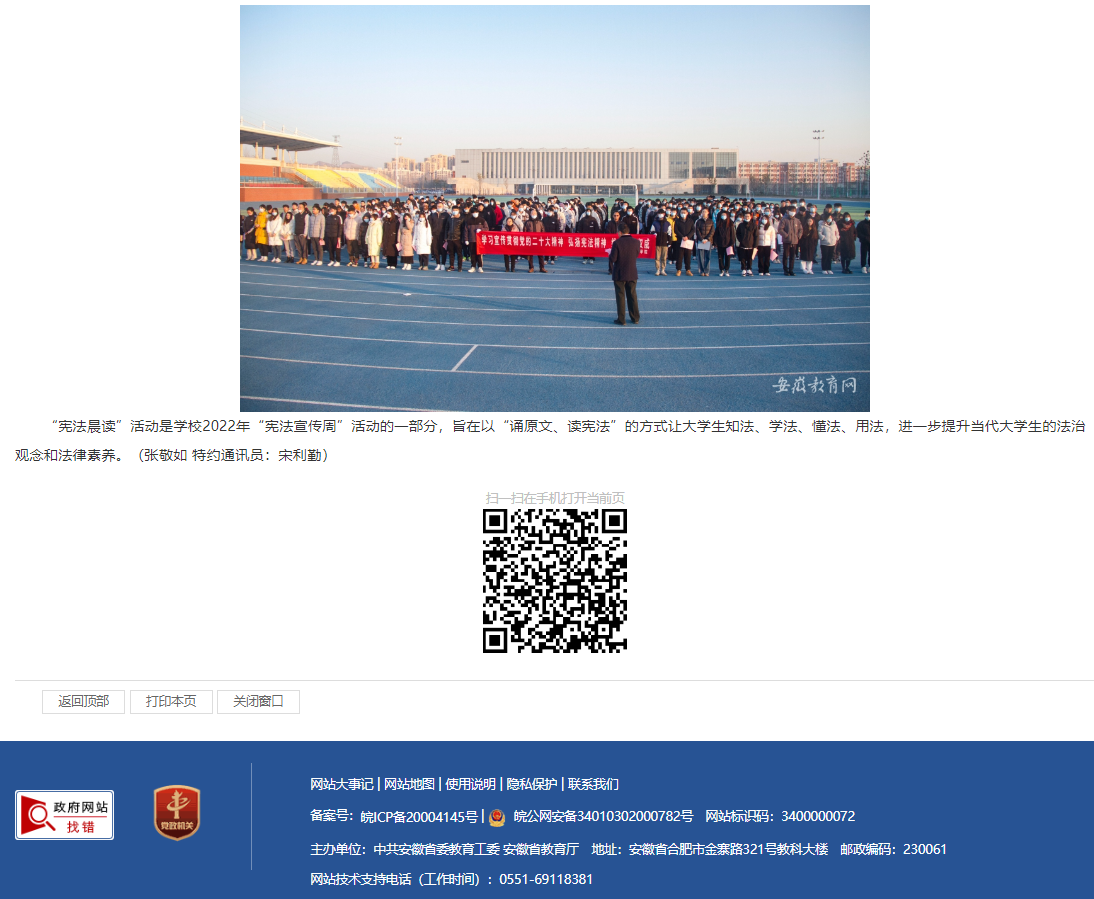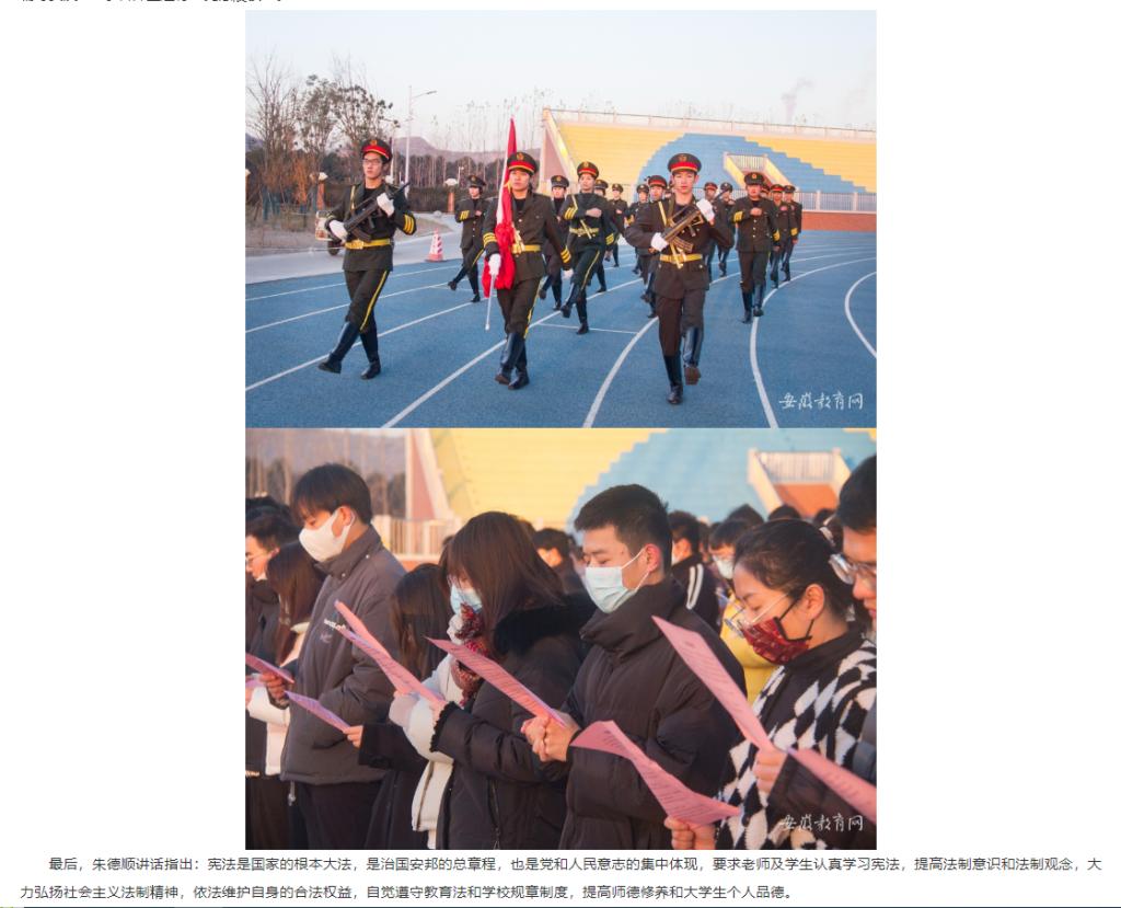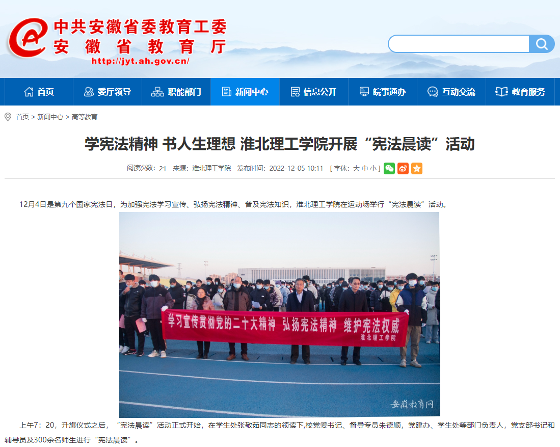 12月4日是第九个国家宪法日,为加强宪法学习宣传、弘扬宪法精神、普及宪法知识,beat365唯一官方网站在运动场举行“宪法晨读”活动。安徽教育网对此进行了报道。