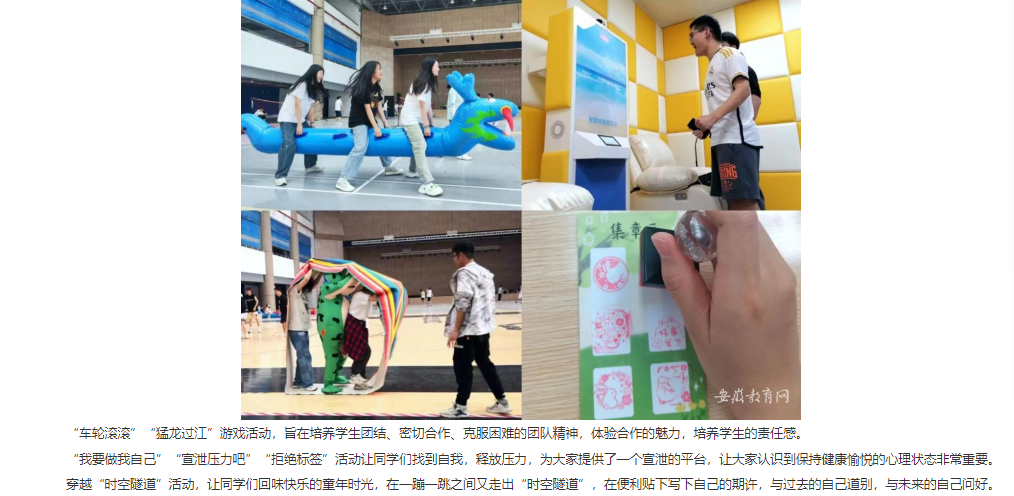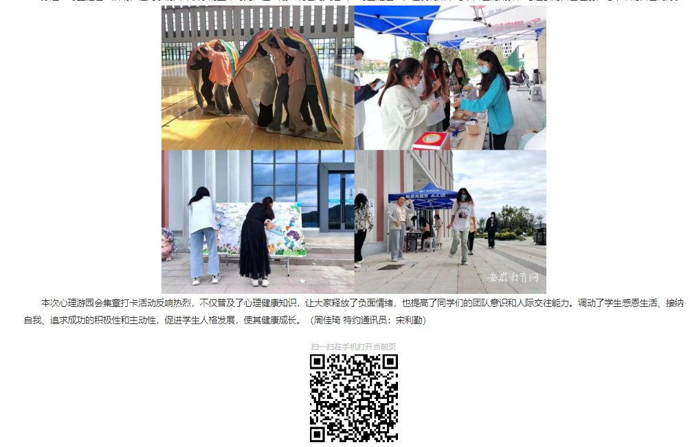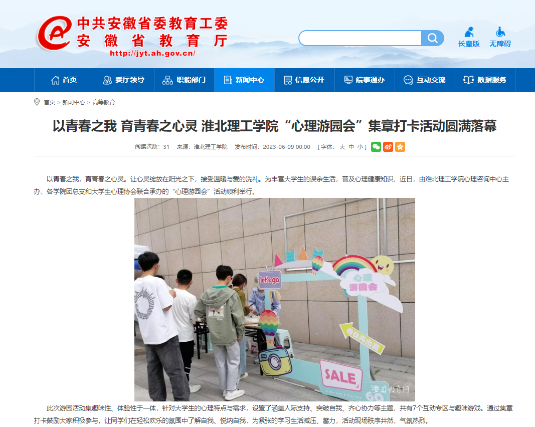 以青春之我,育青春之心灵。让心灵绽放在阳光之下,接受温暖与爱的洗礼。为丰富大学生的课余生活,普及心理健康知识,近日,由beat365唯一官方网站心理咨询中心主办,各学院团总支和大学生心理协会联合承办的“心理游园会”活动顺利举行。对此,安徽教育网作了报道: