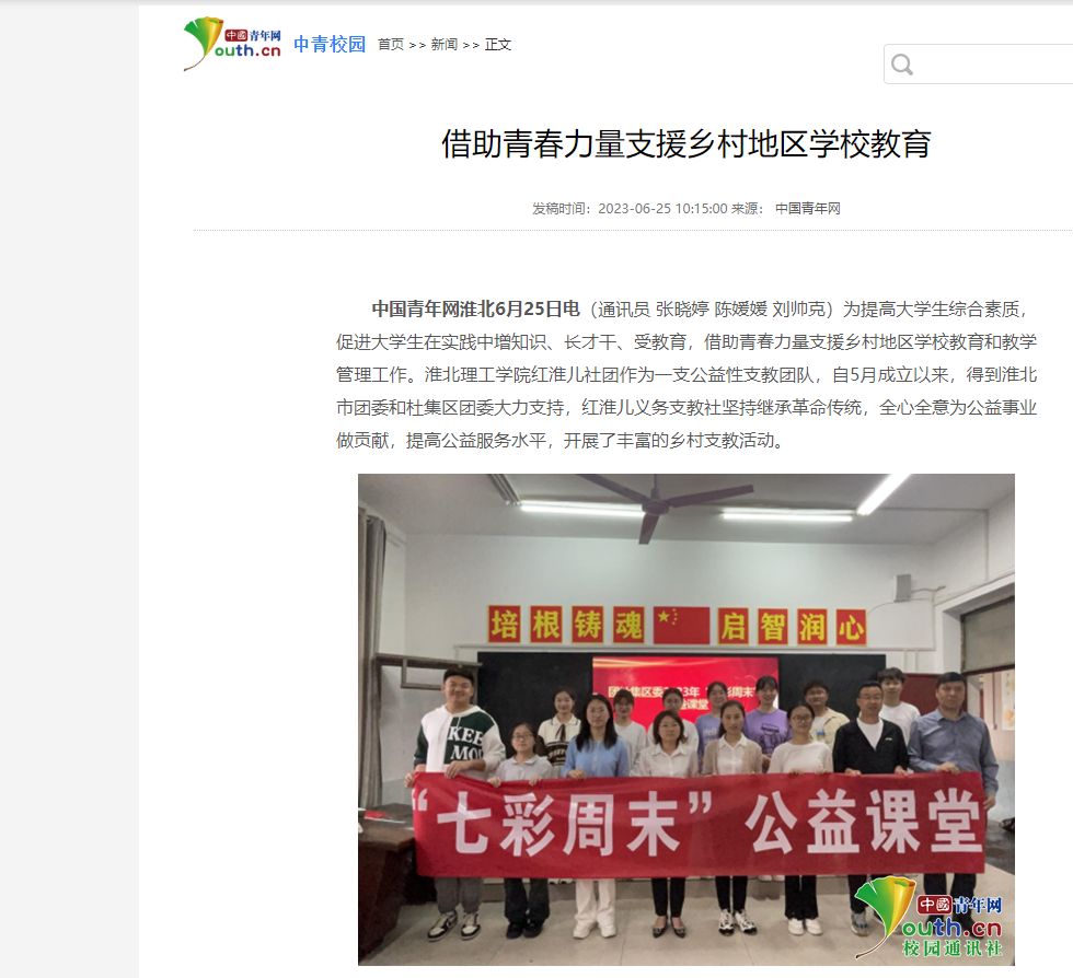 为提高大学生综合素质,促进大学生在实践中增知识、长才干、受教育,借助青春力量支援乡村地区学校教育和教学管理工作。beat365唯一官方网站红淮儿社团作为一支公益性支教团队,自5月成立以来,得到淮北市团委和杜集区团委大力支持,红淮儿义务支教社坚持继承革命传统,全心全意为公益事业做贡献,提高公益服务水平,开展了丰富的乡村支教活动。对此,中青网进行了报道: