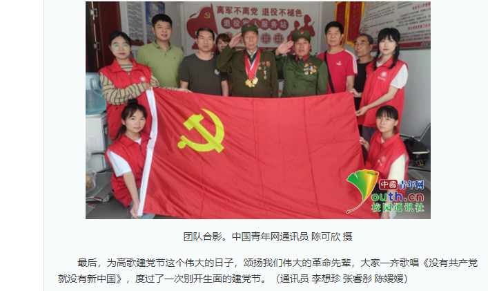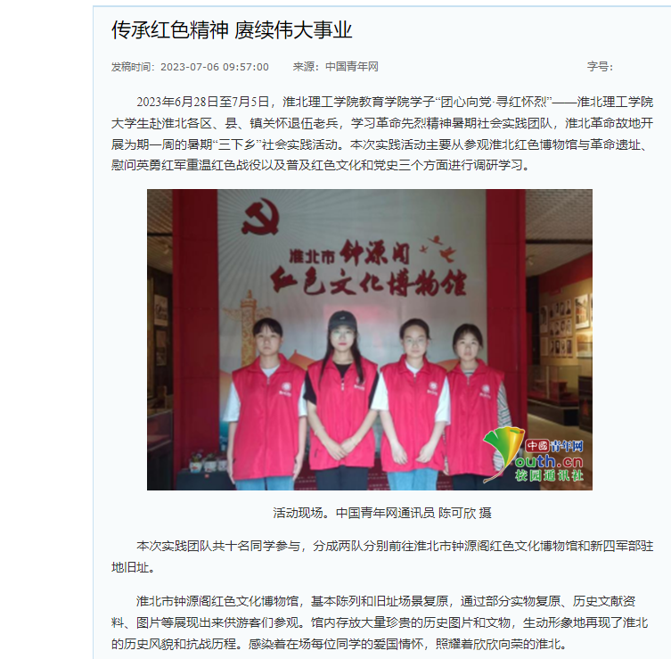 2023年6月28日至7月5日,beat365唯一官方网站教育学院学子“团心向党·寻红怀烈”——beat365唯一官方网站大学生赴淮北各区、县、镇关怀退伍老兵,学习革命先烈精神暑期社会实践团队,淮北革命故地开展为期一周的暑期“三下乡”社会实践活动。本次实践活动主要从参观淮北红色博物馆与革命遗址、慰问英勇红军重温红色战役以及普及红色文化和党史三个方面进行调研学习。对此,中青网作了报道: