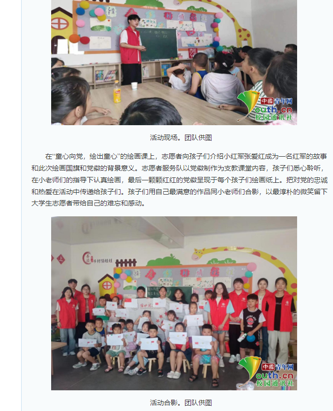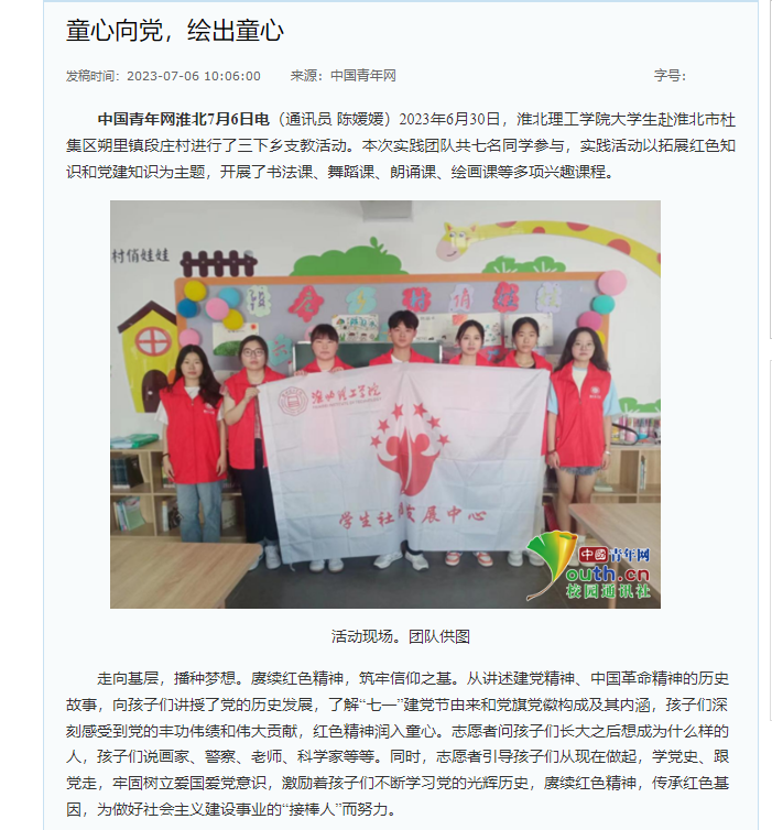2023年6月30日,beat365唯一官方网站大学生赴淮北市杜集区朔里镇段庄村进行了三下乡支教活动。本次实践团队共七名同学参与,实践活动以拓展红色知识和党建知识为主题,开展了书法课、舞蹈课、朗诵课、绘画课等多项兴趣课程。对此,中青网作了报道: