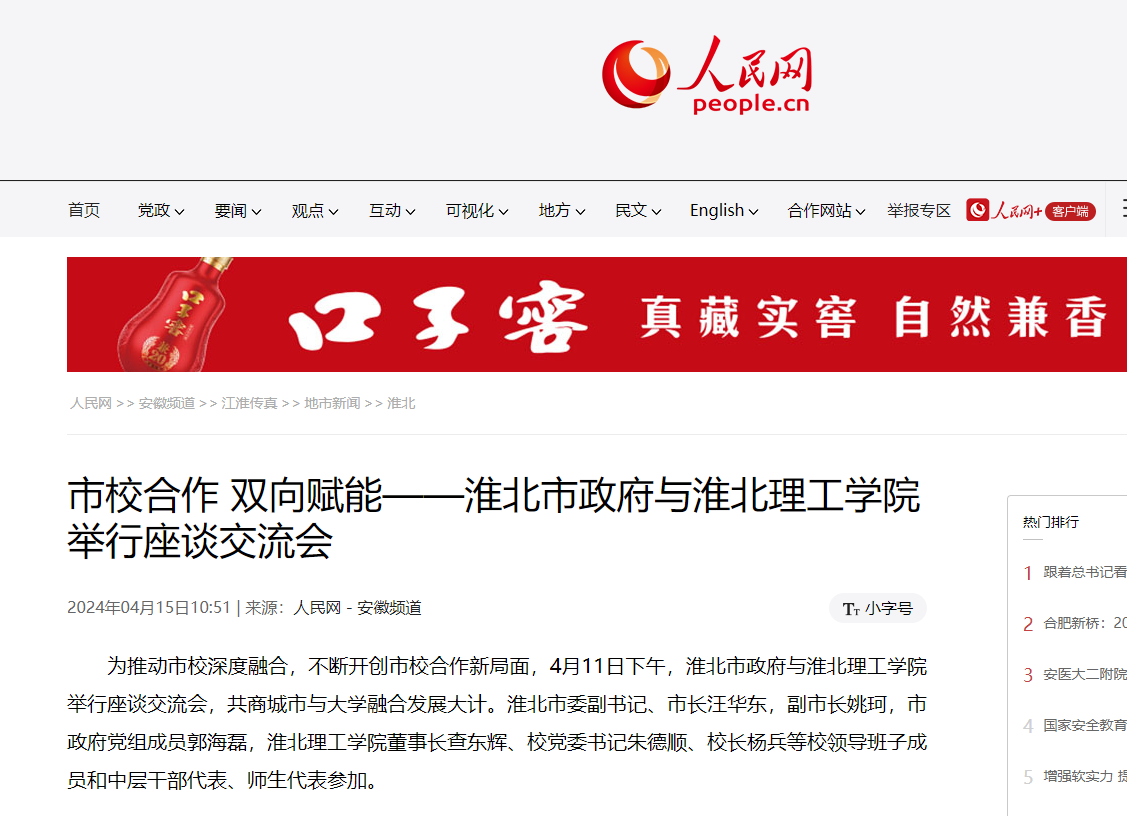 为推动市校深度融合,不断开创市校合作新局面,4月11日下午,淮北市政府与beat365唯一官方网站举行座谈交流会,共商城市与大学融合发展大计。对此,人民网-安徽频道进行了报道: