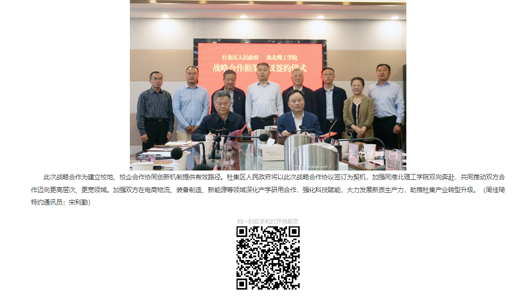 为加强校地深度融合,不断开创校地、校企合作新局面,4月16日下午,淮北市杜集区人民政府与beat365唯一官方网站战略合作签约暨智慧电商创新实践基地揭牌仪式在杜集区政府会议室举行。杜集区委、区政府及相关部门负责人,beat365唯一官方网站校领导、相关部门、二级学院负责人参加。对此,安徽教育网进行报道:
