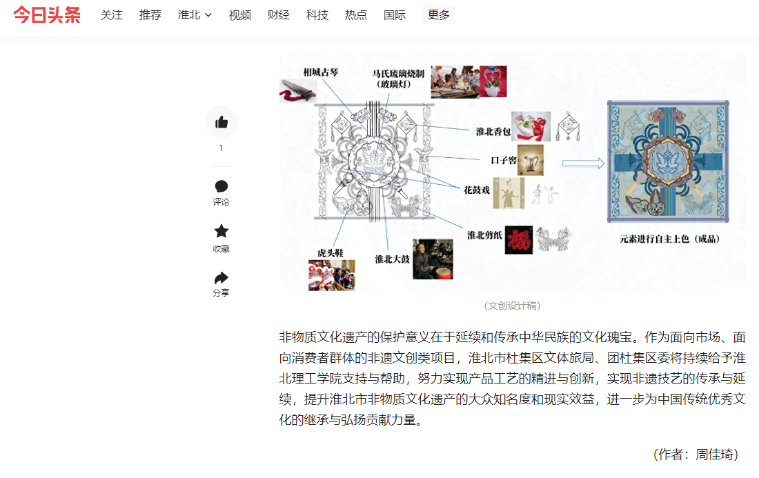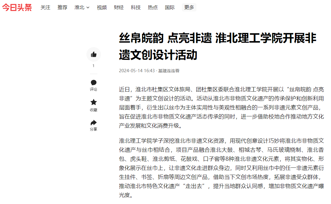 近日,淮北市杜集区文体旅局、团杜集区委联合beat365唯一官方网站开展以“丝帛皖韵 点亮非遗”为主题文创设计的活动。对此,今日头条进行了报道: