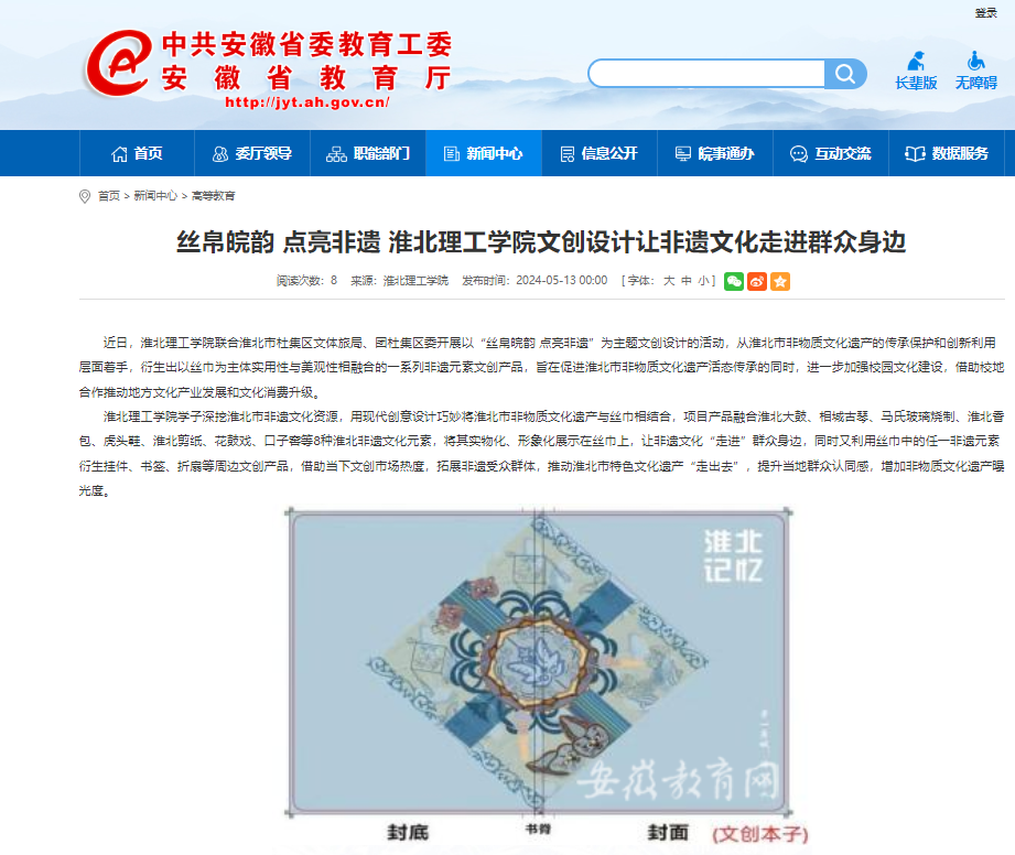 近日,beat365唯一官方网站联合淮北市杜集区文体旅局、团杜集区委开展以“丝帛皖韵 点亮非遗”为主题文创设计的活动,从淮北市非物质文化遗产的传承保护和创新利用层面着手,衍生出以丝巾为主体实用性与美观性相融合的一系列非遗元素文创产品,旨在促进淮北市非物质文化遗产活态传承的同时,进一步加强校园文化建设,借助校地合作推动地方文化产业发展和文化消费升级。对此,安徽教育网进行了报道: