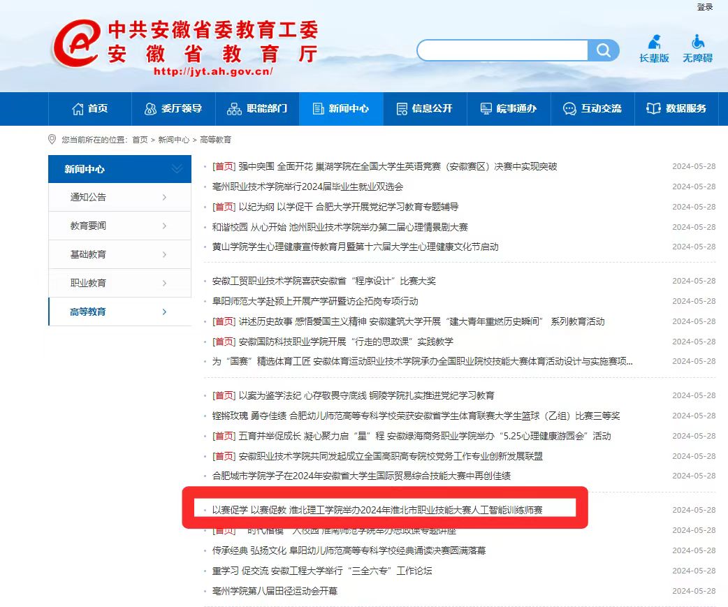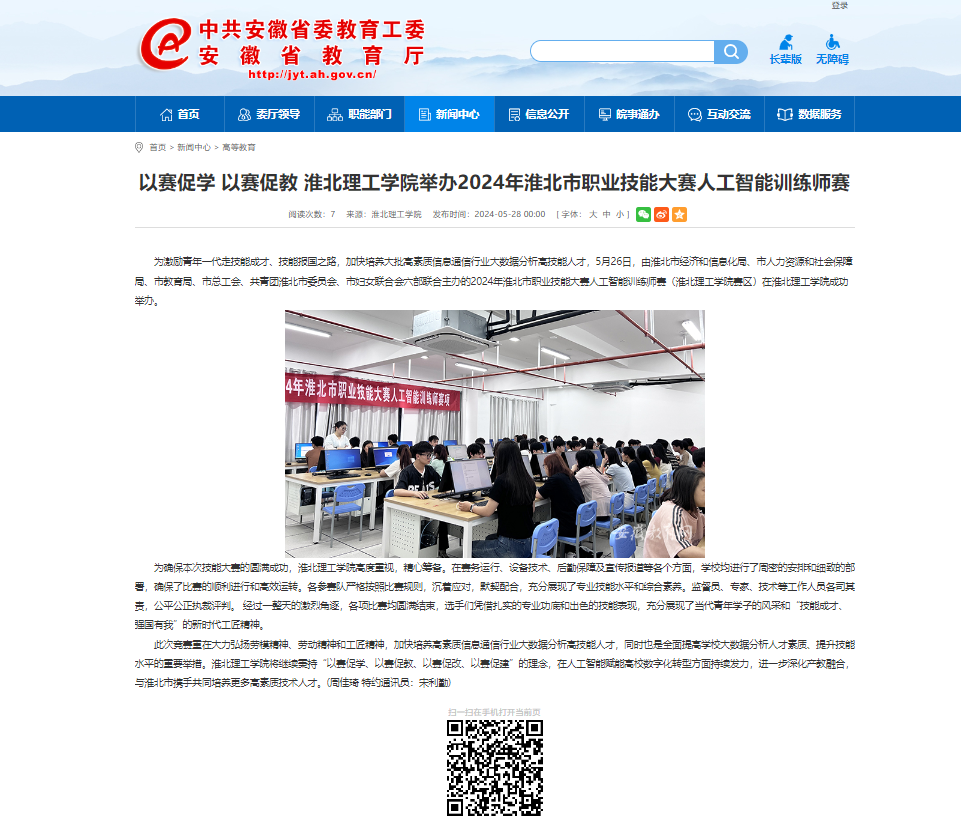 为激励青年一代走技能成才、技能报国之路,加快培养大批高素质信息通信行业大数据分析高技能人才,5月26日,由淮北市经济和信息化局、市人力资源和社会保障局、市教育局、市总工会、共青团淮北市委员会、市妇女联合会六部联合主办的2024年淮北市职业技能大赛人工智能训练师赛(beat365唯一官方网站赛区)在beat365唯一官方网站成功举办。对此,安徽教育网进行了报道: