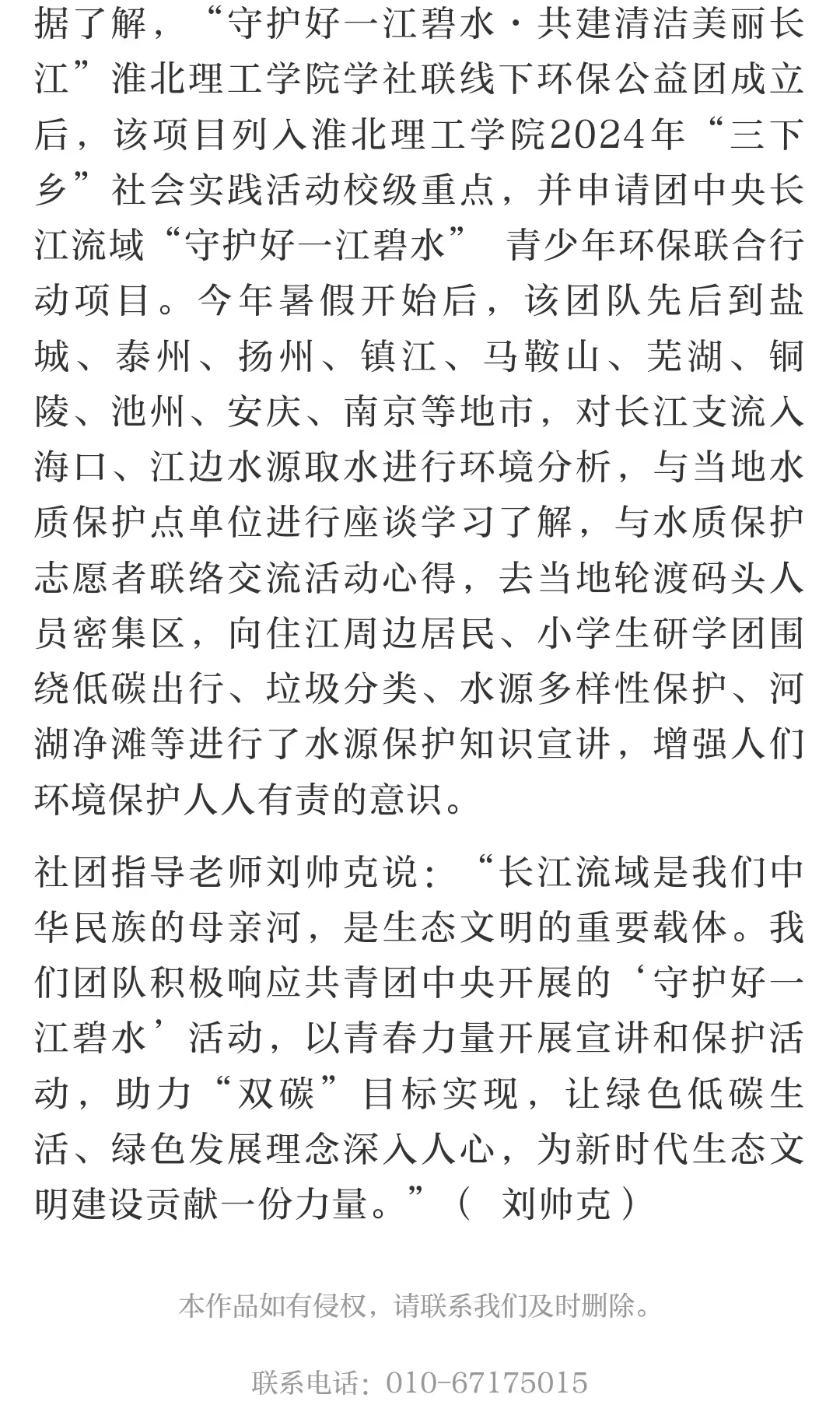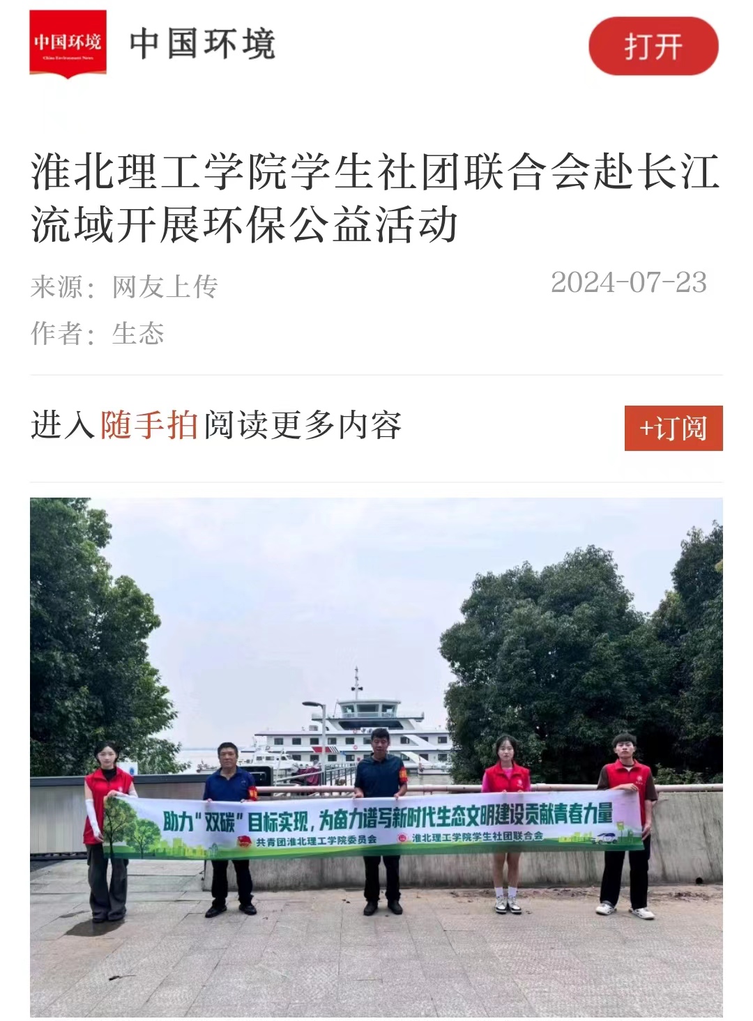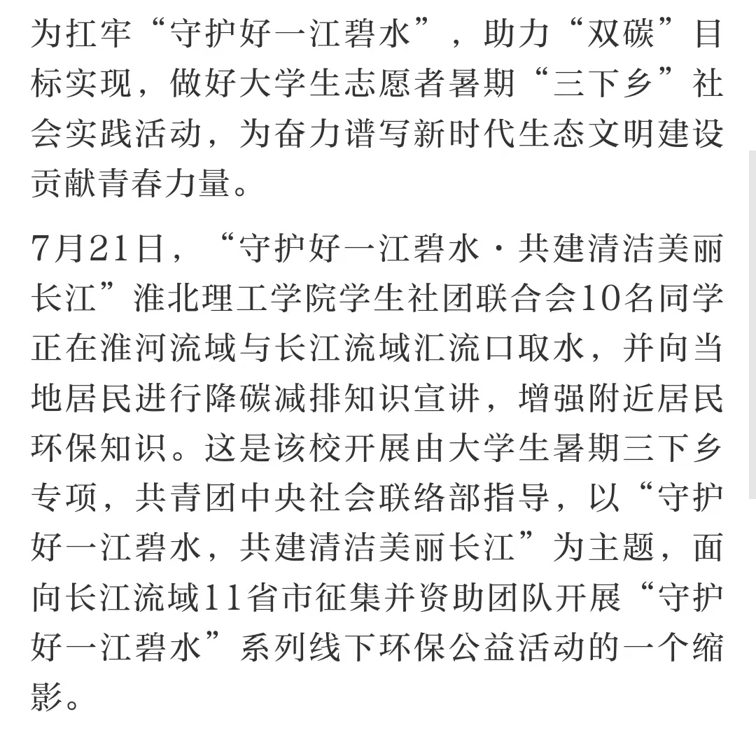 7月21日,“守护好一江碧水·共建清洁美丽长江”beat365唯一官方网站学生社团联合会10名同学正在淮河流域与长江流域汇流口取水,并向当地居民进行降碳减排知识宣讲,增强附近居民环保知识。这是该校开展由大学生暑期三下乡专项,共青团中央社会联络部指导,以“守护好一江碧水,共建清洁美丽长江”为主题,面向长江流域11省市征集并资助团队开展“守护好一江碧水”系列线下环保公益活动的一个缩影。对此,中国环境网进行了报道: