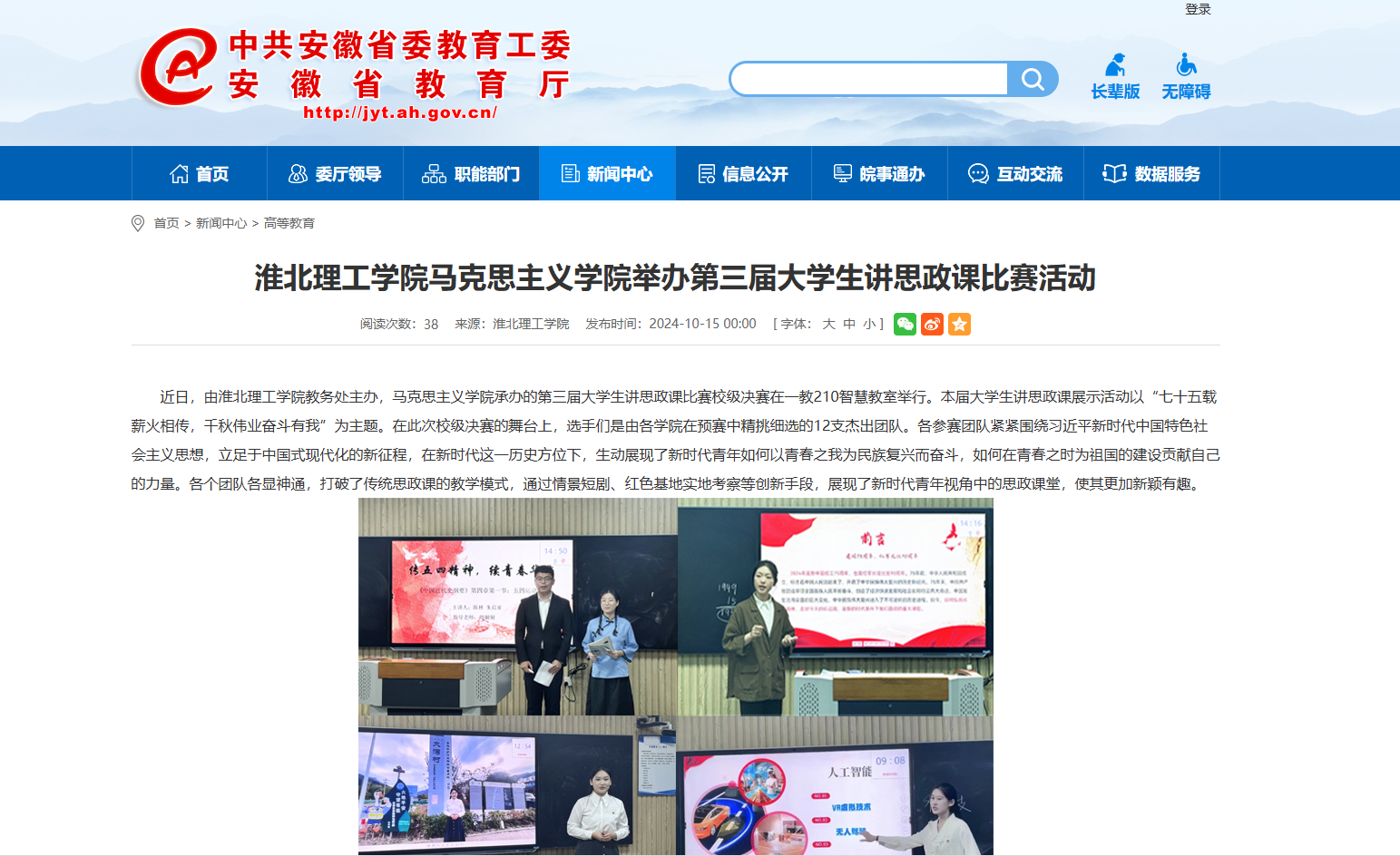 近日,由beat365唯一官方网站教务处主办,马克思主义学院承办的第三届大学生讲思政课比赛校级决赛在一教210智慧教室举行。本届大学生讲思政课展示活动以“七十五载薪火相传,千秋伟业奋斗有我”为主题。在此次校级决赛的舞台上,选手们是由各学院在预赛中精挑细选的12支杰出团队。各参赛团队紧紧围绕习近平新时代中国特色社会主义思想,立足于中国式现代化的新征程,在新时代这一历史方位下,生动展现了新时代青年如何以青春之我为民族复兴而奋斗,如何在青春之时为祖国的建设贡献自己的力量。各个团队各显神通,打破了传统思政课的教学模式,通过情景短剧、红色基地实地考察等创新手段,展现了新时代青年视角中的思政课堂,使其更加新颖有趣。对此,安徽教育网进行了报道: