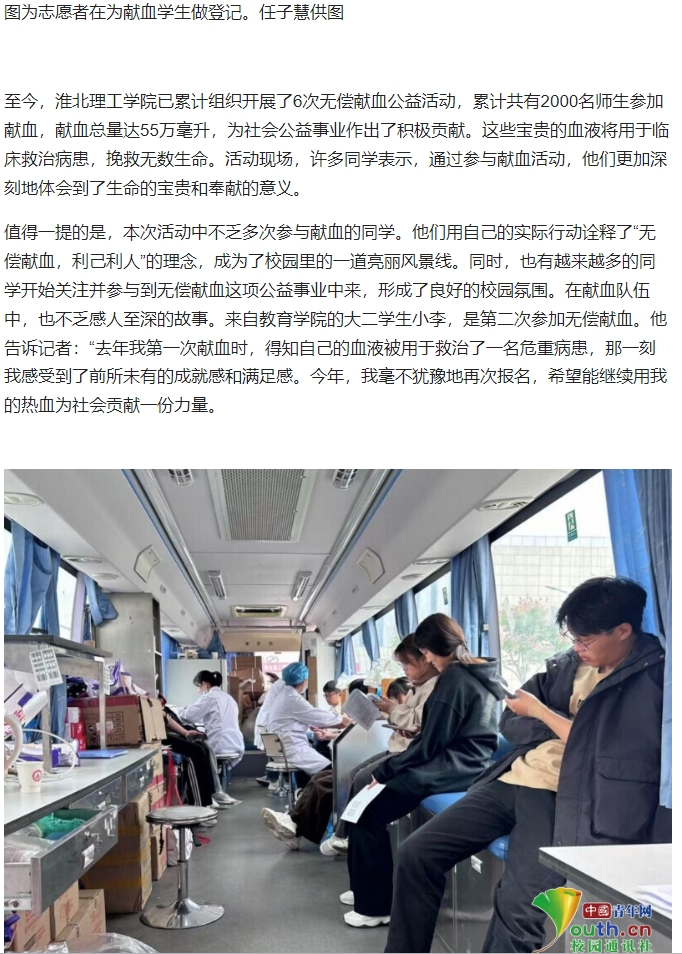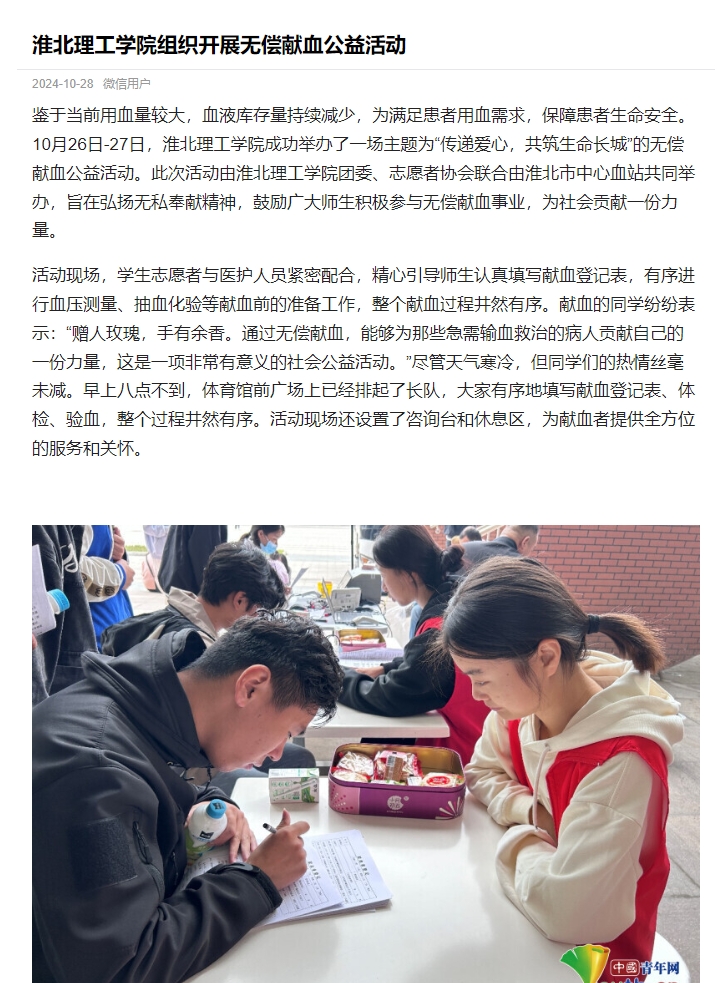 鉴于当前用血量较大,血液库存量持续减少,为满足患者用血需求,保障患者生命安全。10月26日-27日,beat365唯一官方网站成功举办了一场主题为“传递爱心,共筑生命长城”的无偿献血公益活动。此次活动由beat365唯一官方网站团委、志愿者协会联合由淮北市中心血站共同举办,旨在弘扬无私奉献精神,鼓励广大师生积极参与无偿献血事业,为社会贡献一份力量。对此,中青校园进行了报道: