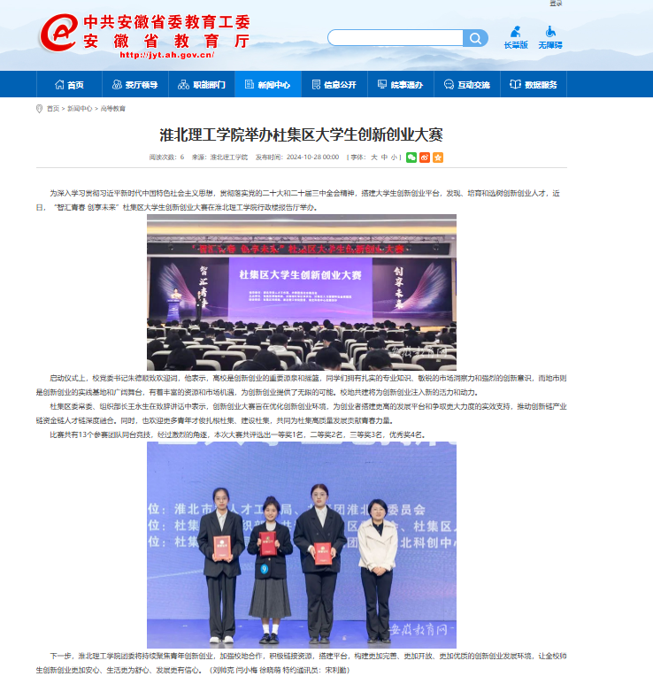 为深入学习贯彻习近平新时代中国特色社会主义思想,贯彻落实党的二十大和二十届三中全会精神,搭建大学生创新创业平台,发现、培育和选树创新创业人才,近日,“智汇青春 创享未来”杜集区大学生创新创业大赛在beat365唯一官方网站行政楼报告厅举办。对此,安徽教育网进行了报道: