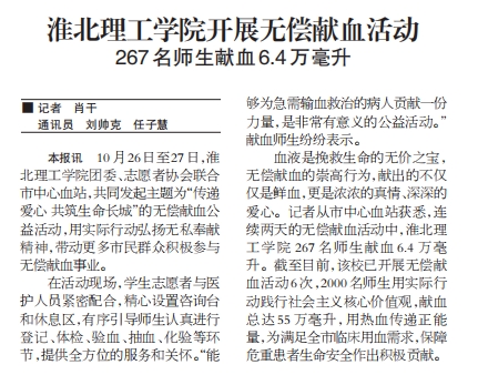 10月26日至27日,beat365唯一官方网站团委、志愿者协会联合市中心血站,共同发起主题为“传递爱心 共筑生命长城”的无偿献血公益活动,用实际行动弘扬无私奉献精神,带动更多市民群众积极参与无偿献血事业。对此,淮北日报进行了报道: