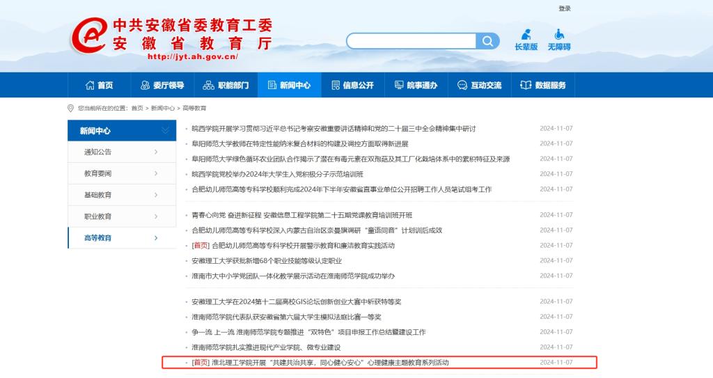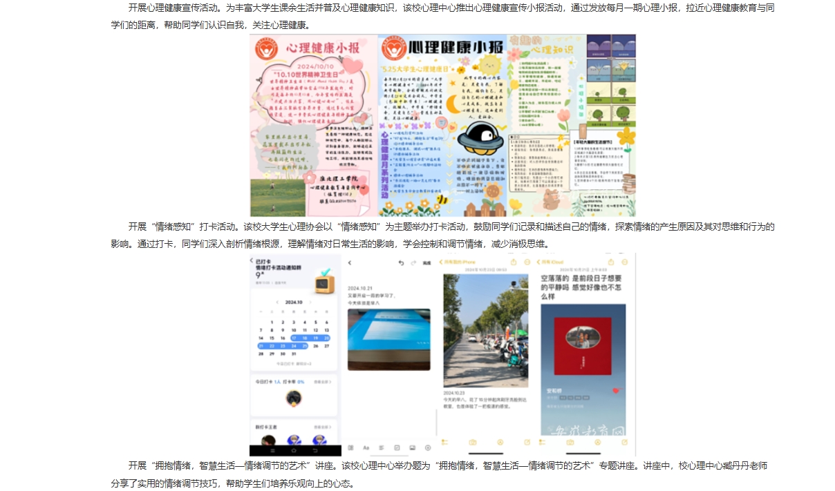 为深入贯彻落实《全面加强和改进新时代学生心理健康工作专项行动计划(2023—2025年)》、《全面加强和改进新时代学生心理健康工作的若干举措》等文件精神,提升大学生心理健康意识,增长精神卫生知识,倡导三全育人氛围。beat365唯一官方网站10月份开展以“共建共治共享,同心健心安心”为主题的心理健康主题教育系列活动。对此,安徽教育网进行了报道: