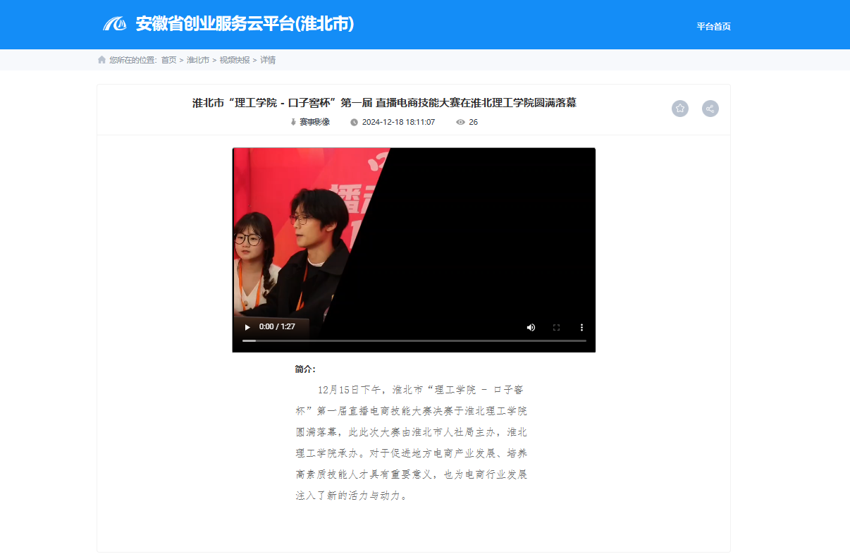12月15日下午,淮北市“理工学院 - 口子窖杯”第一届直播电商技能大赛决赛于beat365唯一官方网站圆满落幕,此此次大赛由淮北市人社局主办,beat365唯一官方网站承办。对于促进地方电商产业发展、培养高素质技能人才具有重要意义,也为电商行业发展注入了新的活力与动力。对此,安徽创业服务云平台进行了报道:
