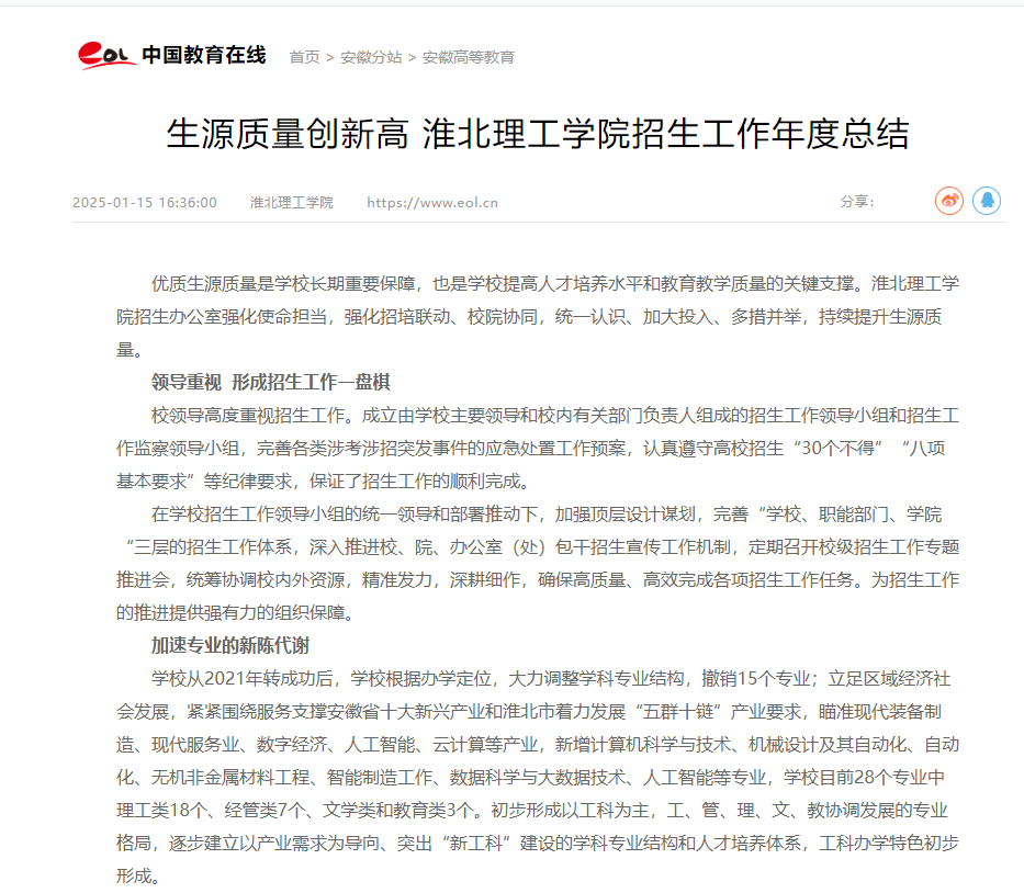 优质生源质量是学校长期重要保障,也是学校提高人才培养水平和教育教学质量的关键支撑。beat365唯一官方网站招生办公室强化使命担当,强化招培联动、校院协同,统一认识、加大投入、多措并举,持续提升生源质量。对此,中国教育在线进行了报道: