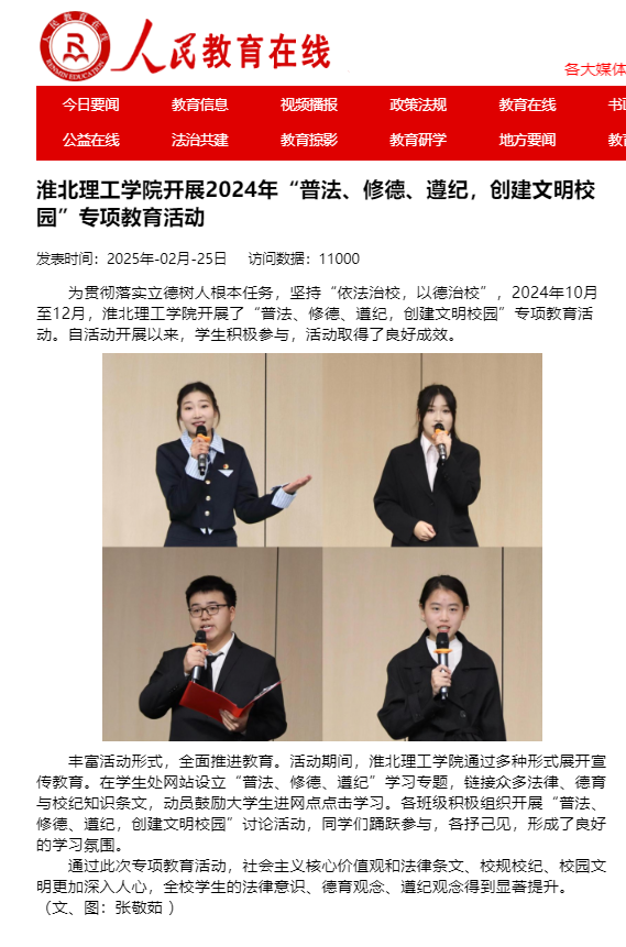 为贯彻落实立德树人根本任务,坚持“依法治校,以德治校”,2024年10月至12月,beat365唯一官方网站开展了“普法、修德、遵纪,创建文明校园”专项教育活动。自活动开展以来,学生积极参与,活动取得了良好成效。对此,人民教育在线进行了报道: