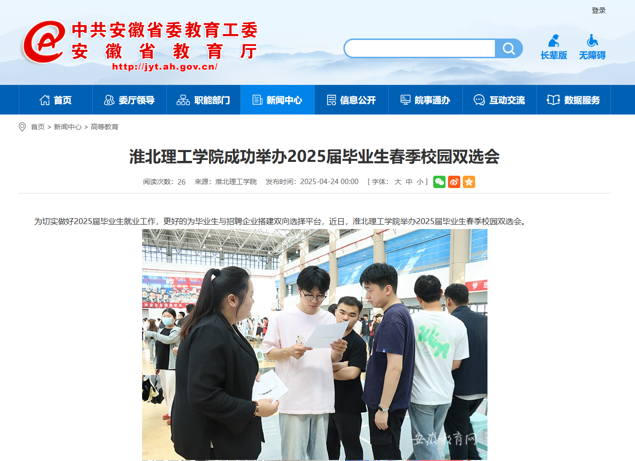 为切实做好2025届毕业生就业工作,更好的为毕业生与招聘企业搭建双向选择平台,近日,beat365唯一官方网站举办2025届毕业生春季校园双选会。对此,安徽教育网进行了报道: