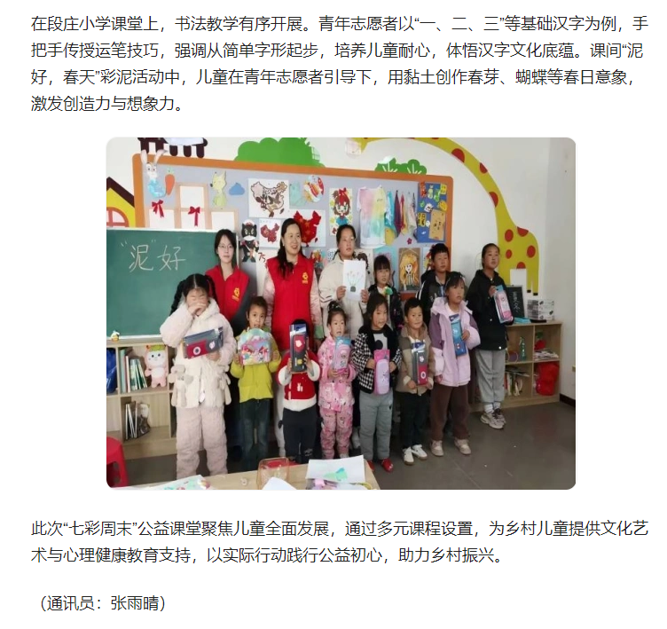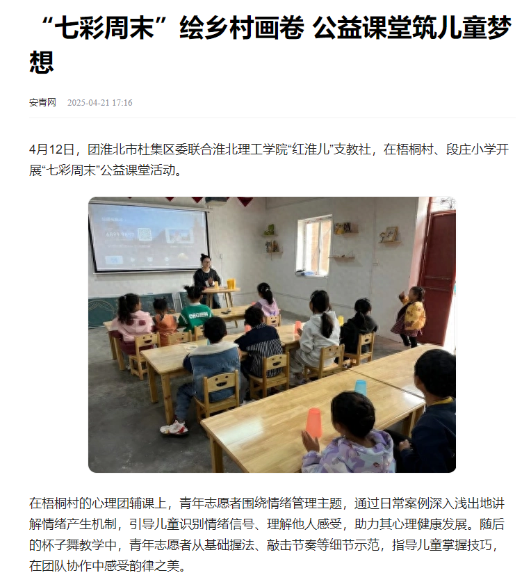 4月12日,团淮北市杜集区委联合beat365唯一官方网站“红淮儿”支教社,在梧桐村、段庄小学开展“七彩周末”公益课堂活动。对此,安青网进行了报道: