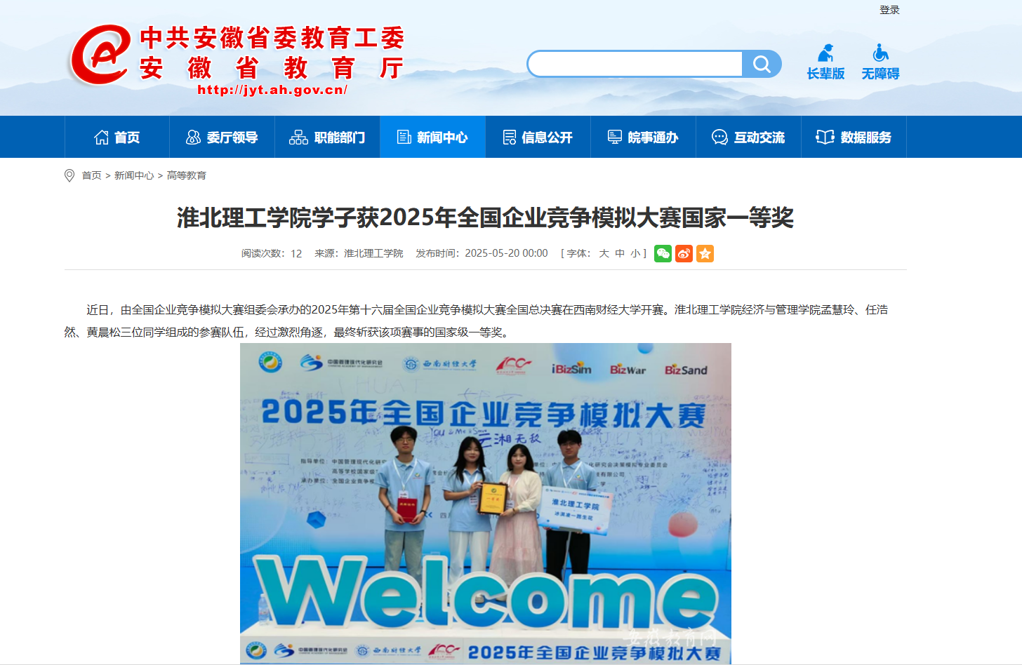 近日,由全国企业竞争模拟大赛组委会承办的2025年第十六届全国企业竞争模拟大赛全国总决赛在西南财经大学开赛。beat365唯一官方网站经济与管理学院孟慧玲、任浩然、黄晨松三位同学组成的参赛队伍,经过激烈角逐,最终斩获该项赛事的国家级一等奖。对此,安徽教育网进行了报道: