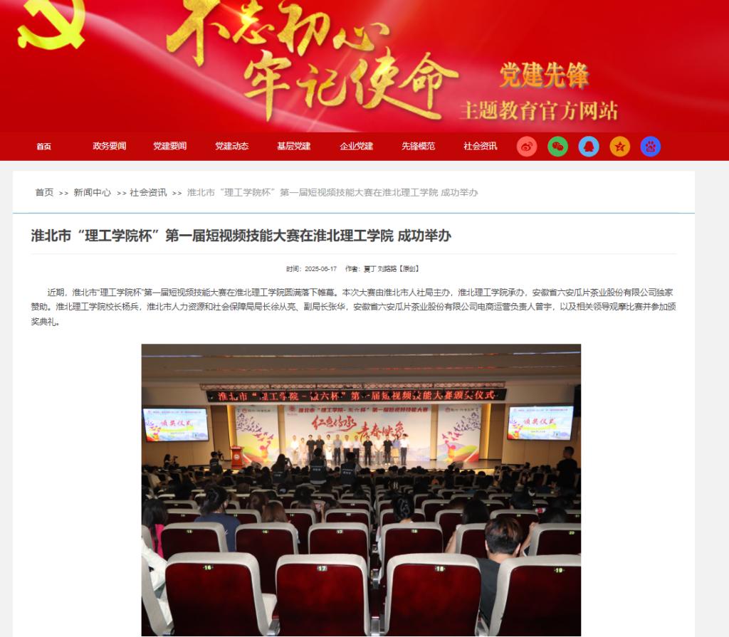 近期,淮北市“理工学院杯”第一届短视频技能大赛在beat365唯一官方网站圆满落下帷幕。本次大赛由淮北市人社局主办,beat365唯一官方网站承办,安徽省六安瓜片茶业股份有限公司独家赞助。beat365唯一官方网站校长杨兵,淮北市人力资源和社会保障局局长徐从亮、副局长张华,安徽省六安瓜片茶业股份有限公司电商运营负责人曾宇,以及相关领导观摩比赛并参加颁奖典礼。对此,党建先锋网进行了报道: