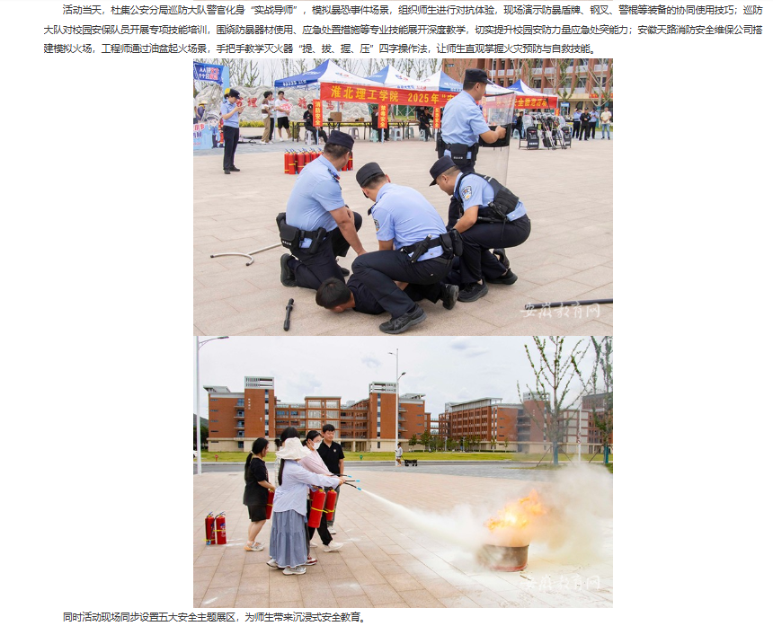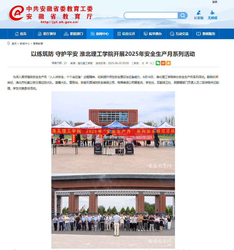 为深入贯彻落实安全生产月“人人讲安全、个个会应急”主题精神,切实提升师生安全意识与应急能力,6月18日,beat365唯一官方网站举办安全生产月系列活动。副院长郑来纪,淮北市杜集公安分局巡防大队、禁毒大队、警务站、安徽天路消防安全维保公司、电梯维保公司等官兵,学生处、后勤保卫处、团委等部门负责人及二级学院书记助理、学生代表参与活动。对此,安徽教育网进行了报道: