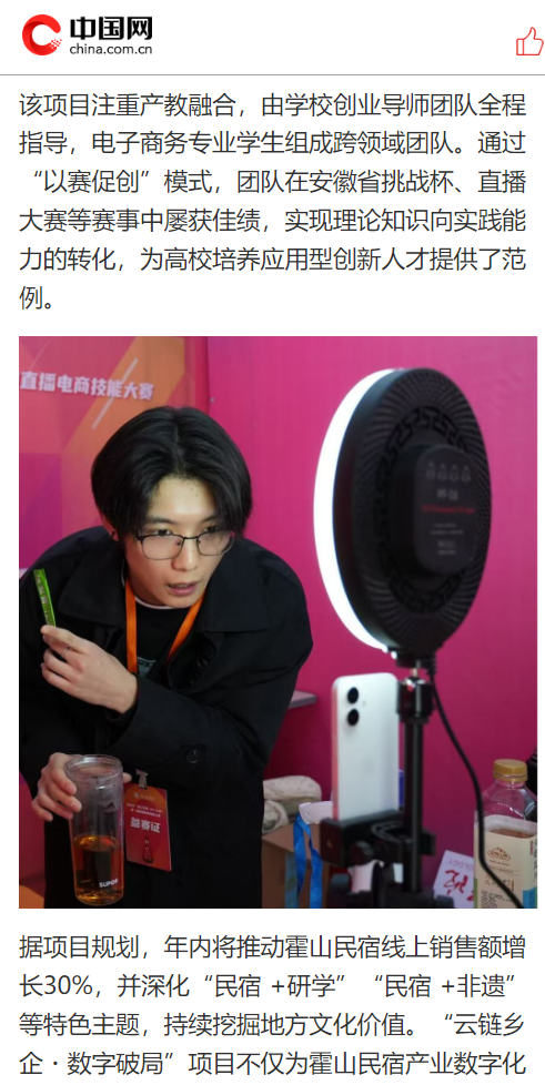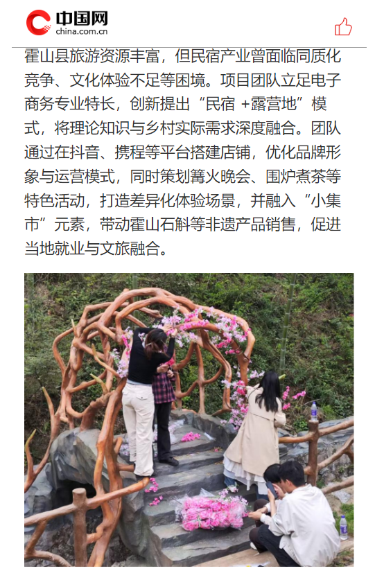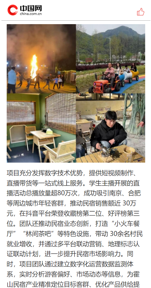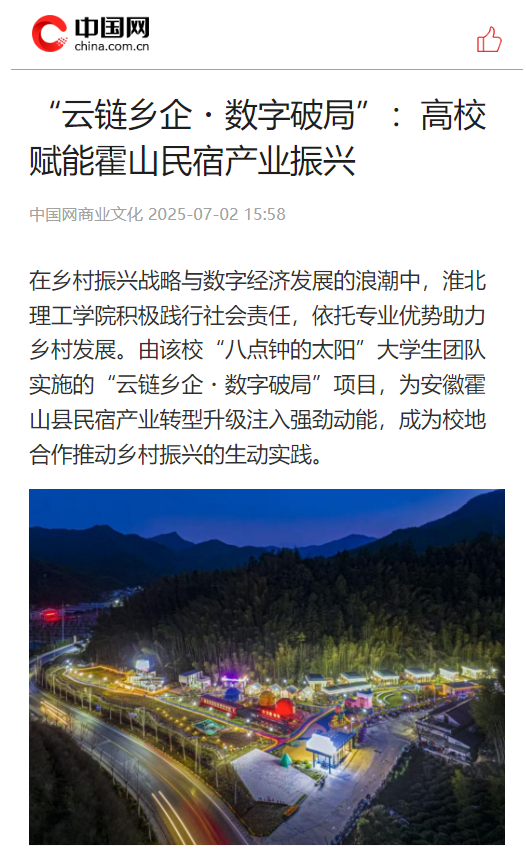 在乡村振兴战略与数字经济发展的浪潮中,beat365唯一官方网站积极践行社会责任,依托专业优势助力乡村发展。由该校“八点钟的太阳”大学生团队实施的“云链乡企・数字破局”项目,为安徽霍山县民宿产业转型升级注入强劲动能,成为校地合作推动乡村振兴的生动实践。对此,中国网进行了报道: