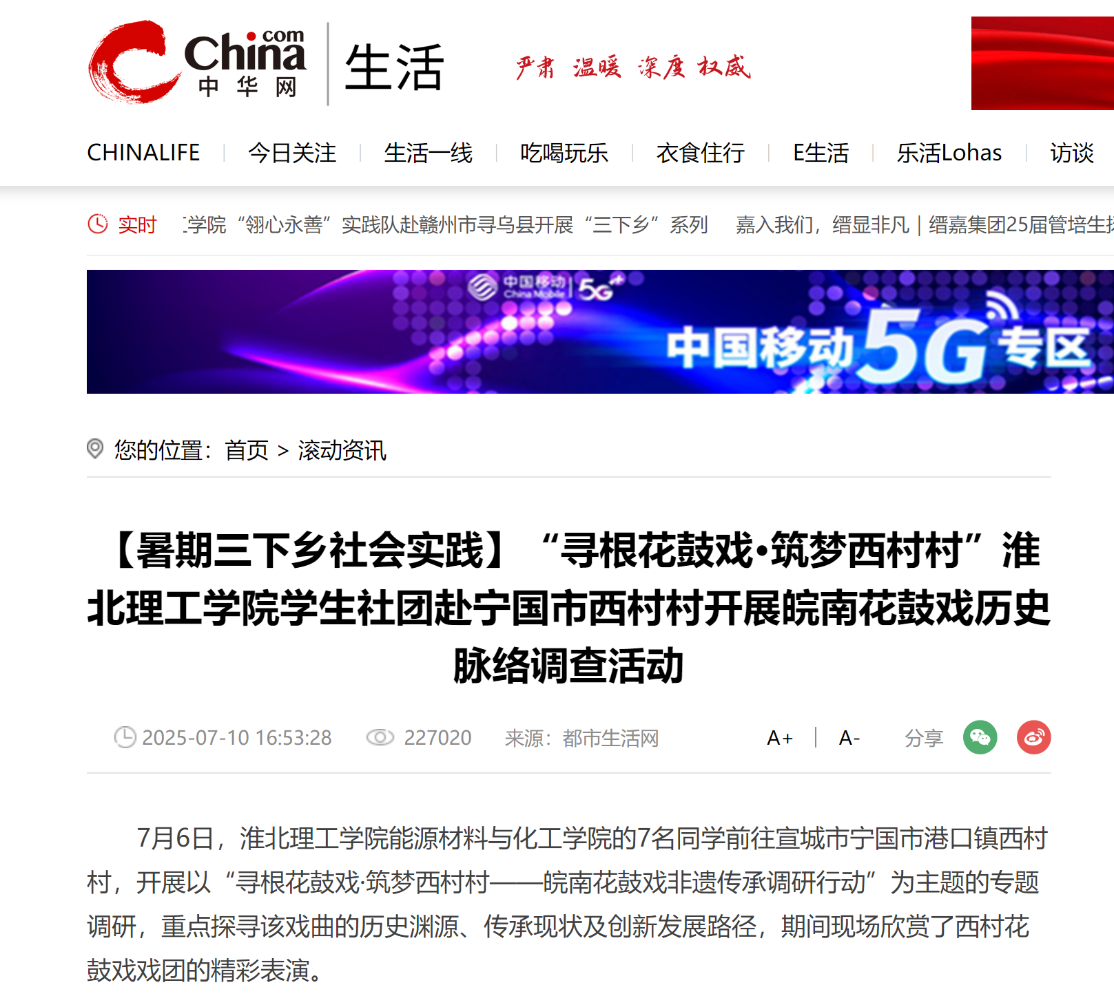 7月6日,beat365唯一官方网站能源材料与化工学院的7名同学前往宣城市宁国市港口镇西村村,开展以“寻根花鼓戏·筑梦西村村——皖南花鼓戏非遗传承调研行动”为主题的专题调研,重点探寻该戏曲的历史渊源、传承现状及创新发展路径,期间现场欣赏了西村花鼓戏戏团的精彩表演。对此,中华网进行了报道: