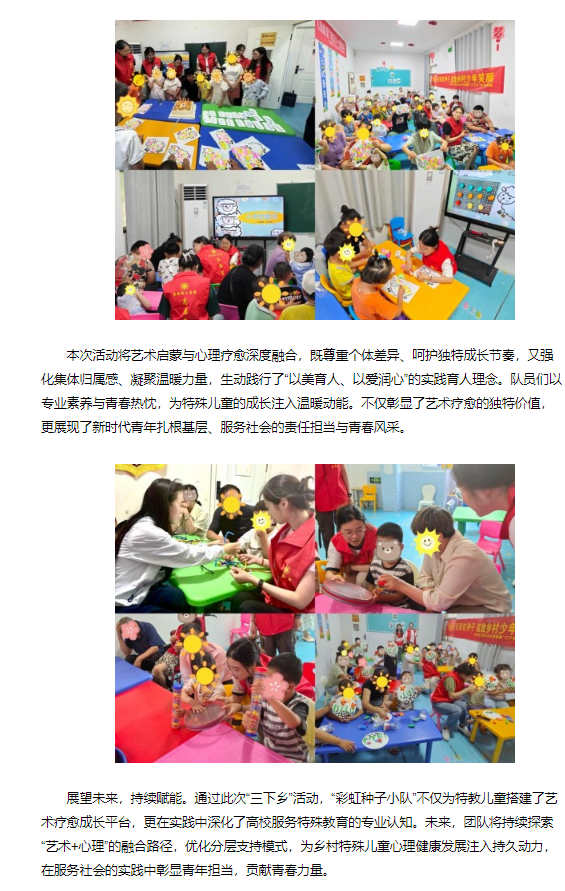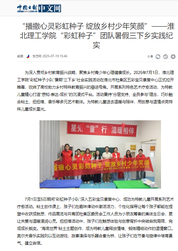 为深入贯彻乡村教育振兴战略,聚焦乡村青少年心理健康成长。2025年7月1日,beat365唯一官方网站“彩虹种子小队”暑期“三下乡”社会实践活动在淮北市杜集区五彩宝贝康复中心正式拉开帷幕,吹响了高校助力乡村特殊教育振兴的奋进号角。开展系列特色艺术疗愈活动,为特教儿童精心打造“感知-表达-成长”的沉浸式平台。活动秉持“分层支持、全员参与”理念,巧妙融合粘土、扭扭棒、音乐等多元艺术载体。为特教儿童送去温暖与陪伴,用创意与温情点亮特殊儿童成长星光。对此,中国日报网进行了报道: