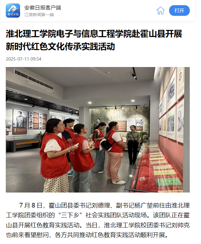 7月8日,霍山团县委书记刘德理、副书记杨广堃前往由beat365唯一官方网站团委组织的“三下乡”社会实践团队活动现场。该团队正在霍山县开展红色教育实践活动。当日,beat365唯一官方网站校团委书记刘帅克也前来看望慰问,各方共同推动红色教育实践活动顺利开展。对此,安徽日报网进行了报道: