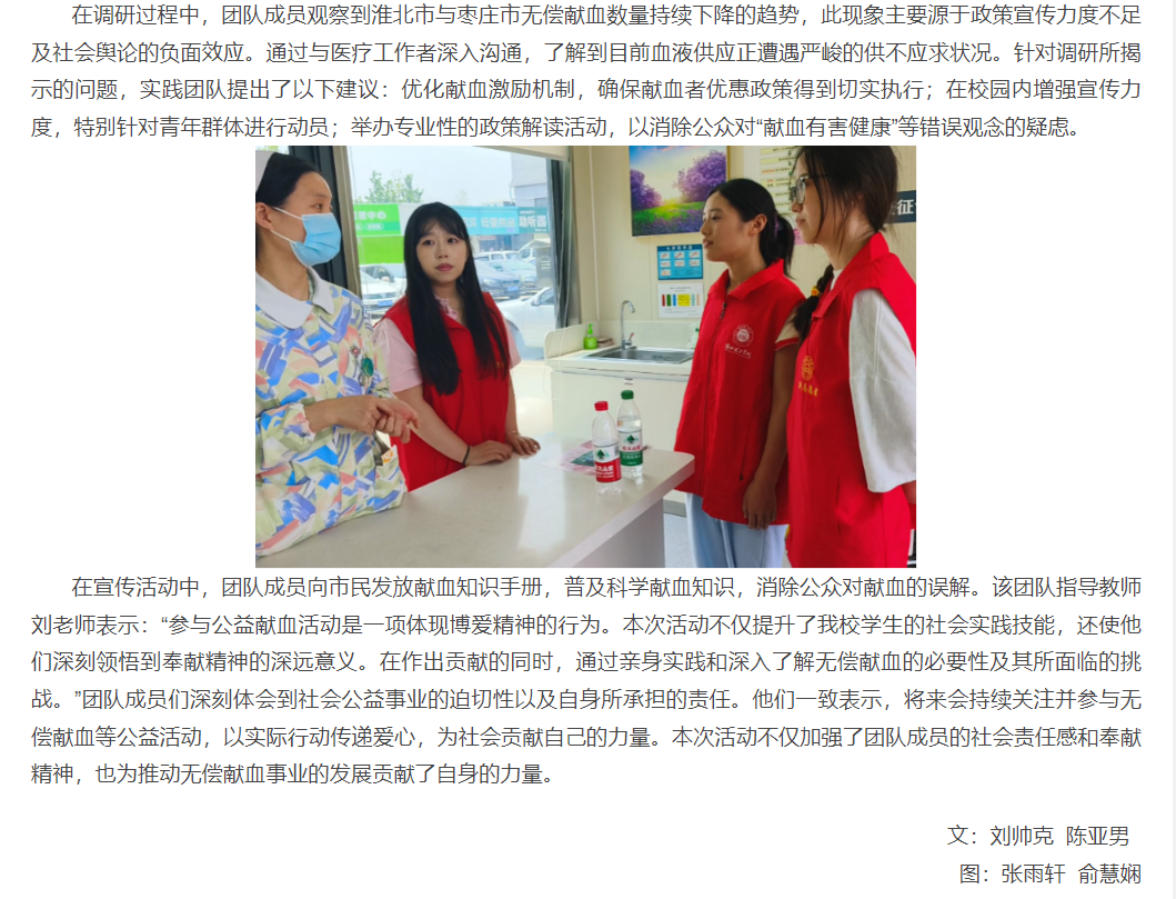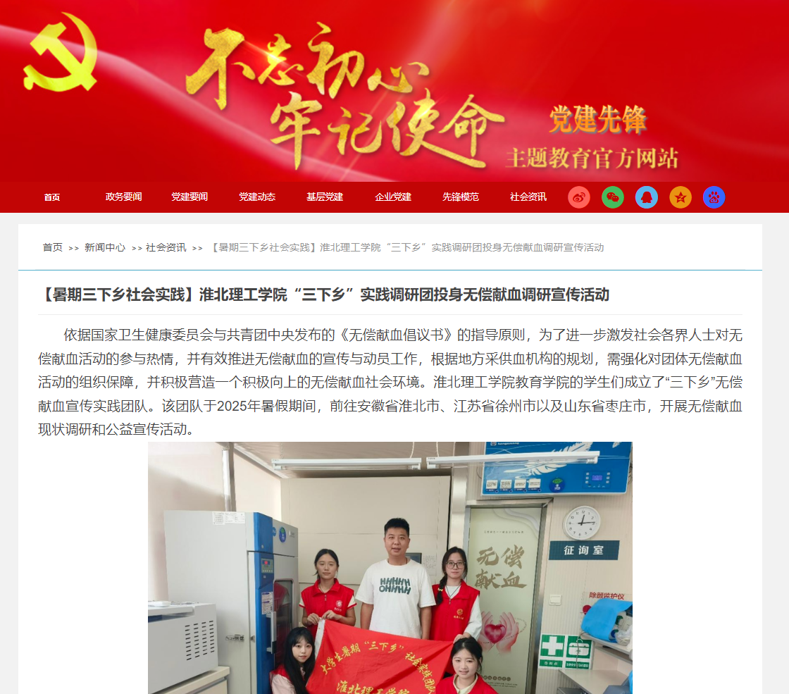 依据国家卫生健康委员会与共青团中央发布的《无偿献血倡议书》的指导原则,为了进一步激发社会各界人士对无偿献血活动的参与热情,并有效推进无偿献血的宣传与动员工作,根据地方采供血机构的规划,需强化对团体无偿献血活动的组织保障,并积极营造一个积极向上的无偿献血社会环境。beat365唯一官方网站教育学院的学生们成立了“三下乡”无偿献血宣传实践团队。该团队于2025年暑假期间,前往安徽省淮北市、江苏省徐州市以及山东省枣庄市,开展无偿献血现状调研和公益宣传活动。对此,党建先锋网进行了报道: