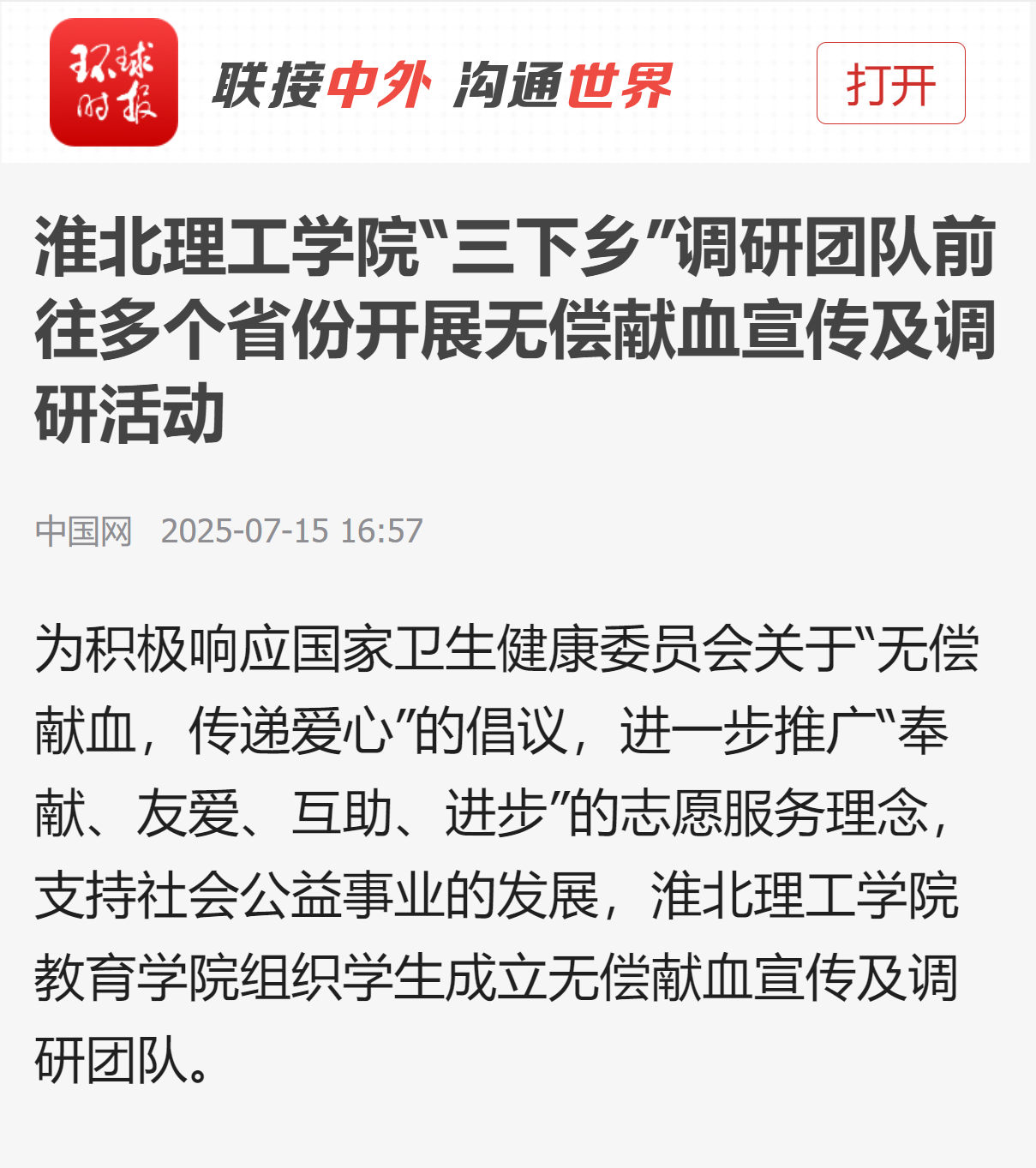 为积极响应国家卫生健康委员会关于“无偿献血,传递爱心”的倡议,进一步推广“奉献、友爱、互助、进步”的志愿服务理念,支持社会公益事业的发展,beat365唯一官方网站教育学院组织学生成立无偿献血宣传及调研团队。对此,环球时报进行了报道: