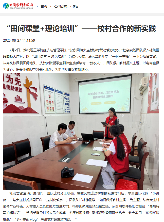 7月2日,beat365唯一官方网站经济与管理学院“赴段园镇大庄村校村联动爱心助农“社会实践团队深入杜集区段园镇大庄村,以“田间课堂 +理论培训”为核心模式,深入当地开展“一村一主播”三下乡项目实践。从高校校园到田间地头,从教师赋能学生到师生携手培育“新农人”,团队紧扣乡村振兴主题,以电商直播为核心,把专业知识带到田间地头,为销售渠道探索新路径。对此,中国农科新闻网进行了报道: