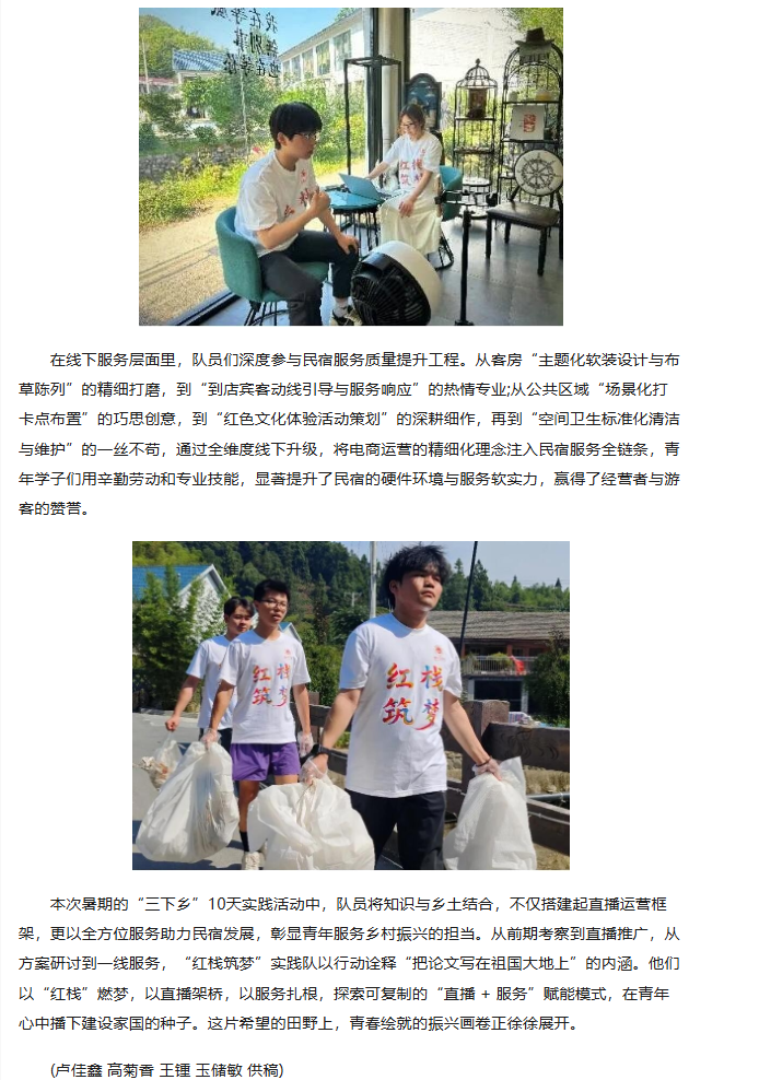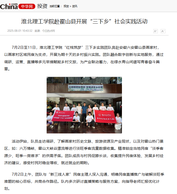 7月2日至11日,beat365唯一官方网站“红栈筑梦”三下乡实践团队奔赴安徽六安霍山县画家村,以画家村区域民宿为支点,开展为期十天的乡村振兴实践。团队融合数字创新与实地服务,通过调研、运营、直播等多元举措赋能乡村文旅,为产业联动蓄力,在绿水青山间谱写青春奋斗篇章。对此,中华网进行了报道: