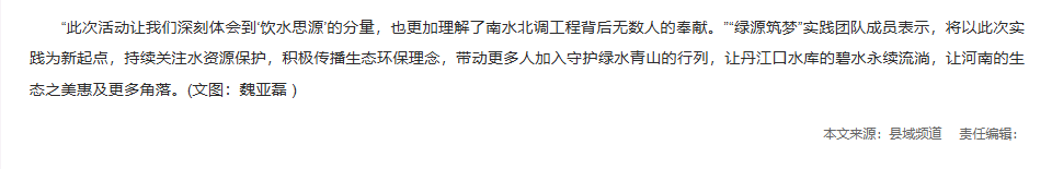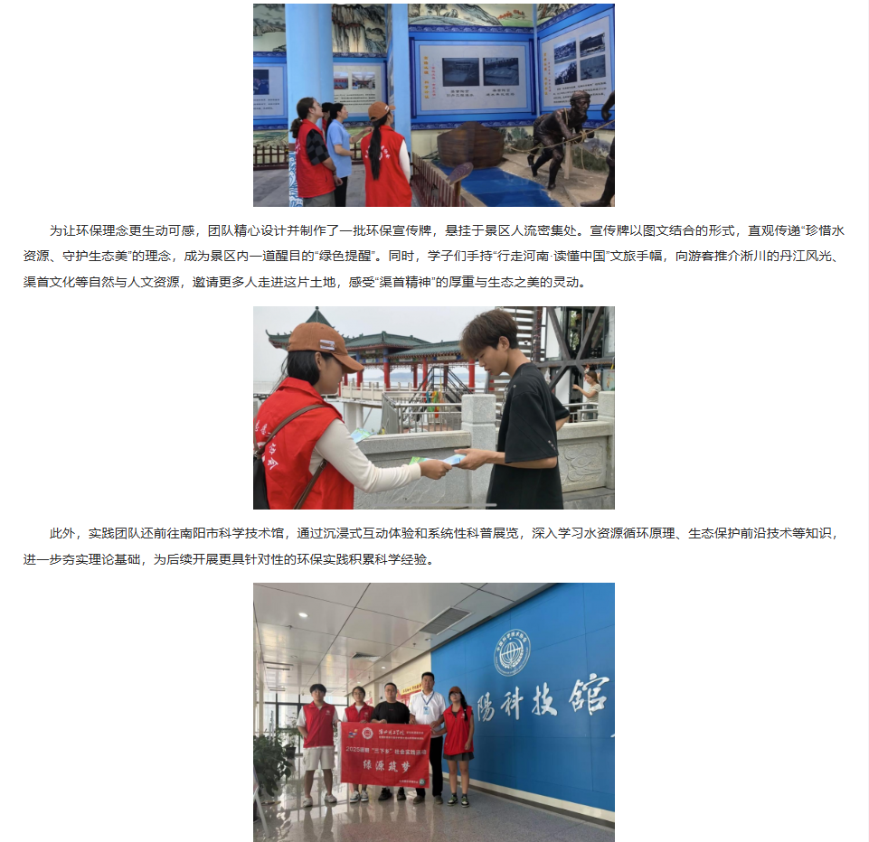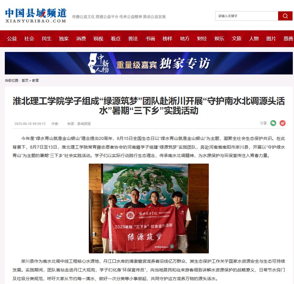 今年是“绿水青山就是金山银山”理念提出20周年,8月15日全国生态日以“绿水青山就是金山银山”为主题,凝聚全社会生态保护共识。在此背景下,8月7日至13日,beat365唯一官方网站常青藤志愿者协会的河南籍学子组建“绿源筑梦”实践团队,奔赴河南省南阳市淅川县,开展以“守护绿水青山”为主题的暑期“三下乡”社会实践活动。学子们以实际行动践行生态理念,传承南水北调精神,为水源保护与环保宣传注入青春力量。对此,中国县域频道进行了报道: