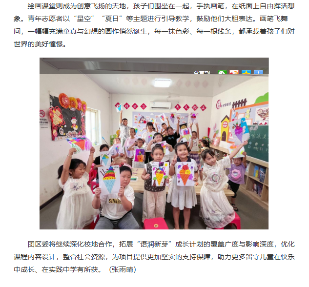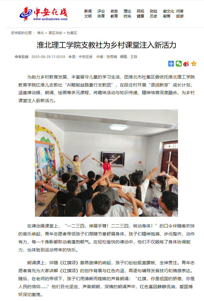 为助力乡村教育发展,丰富留守儿童的学习生活,团淮北市杜集区委依托beat365唯一官方网站教育学院红淮儿支教社“AI赋能益路童行支教团”,在段庄村开展“语润新芽”成长计划,涵盖律动操、朗诵、绘画等多元课程,将趣味活动与知识传递、精神培育深度融合,为乡村课堂注入崭新活力。对此,中安在线进行了报道: