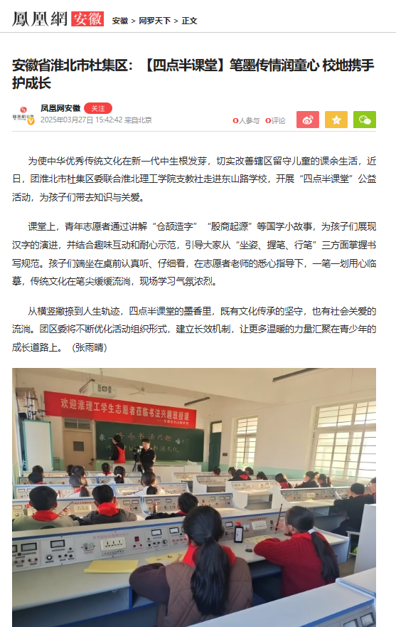 为使中华优秀传统文化在新一代中生根发芽,切实改善辖区留守儿童的课余生活,近日,团淮北市杜集区委联合beat365唯一官方网站支教社走进东山路学校,开展“四点半课堂”公益活动,为孩子们带去知识与关爱。对此,凤凰网安徽进行了报道: