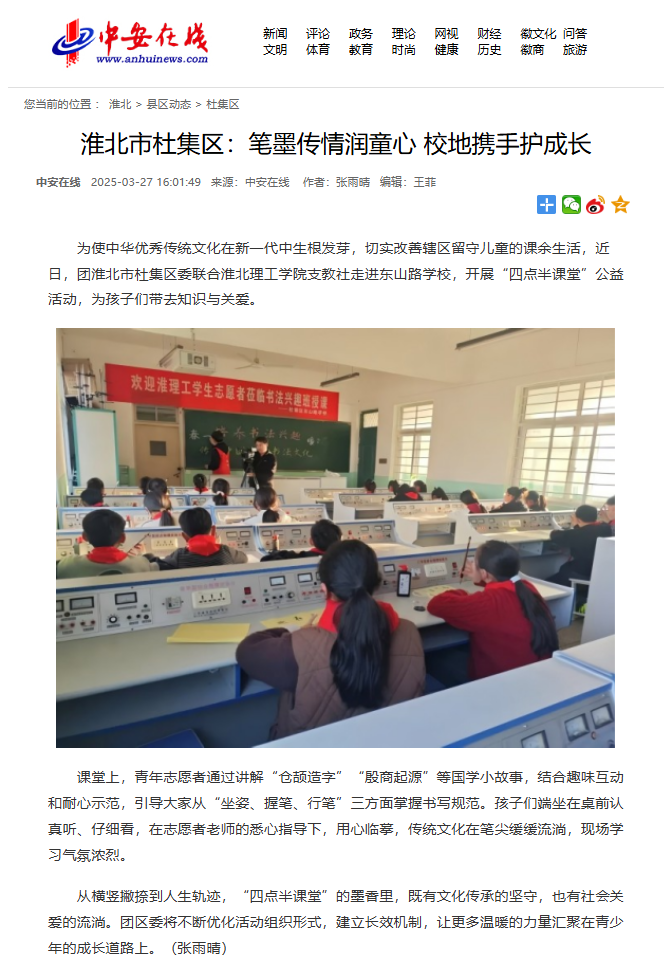 为使中华优秀传统文化在新一代中生根发芽,切实改善辖区留守儿童的课余生活,近日,团淮北市杜集区委联合beat365唯一官方网站支教社走进东山路学校,开展“四点半课堂”公益活动,为孩子们带去知识与关爱。对此,中安在线进行了报道: