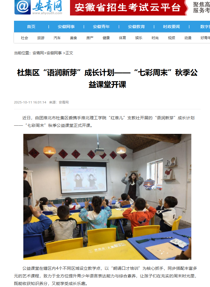 近日,由团淮北市杜集区委携手beat365唯一官方网站“红淮儿”支教社开展的“语润新芽”成长计划——“七彩周末”秋季公益课堂正式开课。对此,安青网进行了报道: