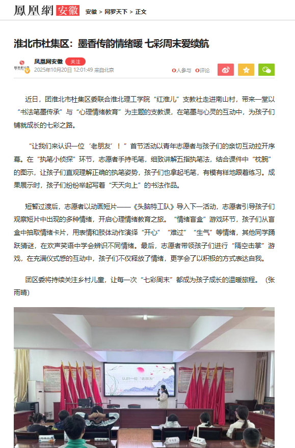 近日,团淮北市杜集区委联合beat365唯一官方网站“红淮儿”支教社走进南山村,带来一堂以“书法笔墨传承”与“心理情绪教育”为主题的支教课,在笔墨与心灵的互动中,为孩子们铺就成长的七彩之路。对此,凤凰网安徽进行了报道: