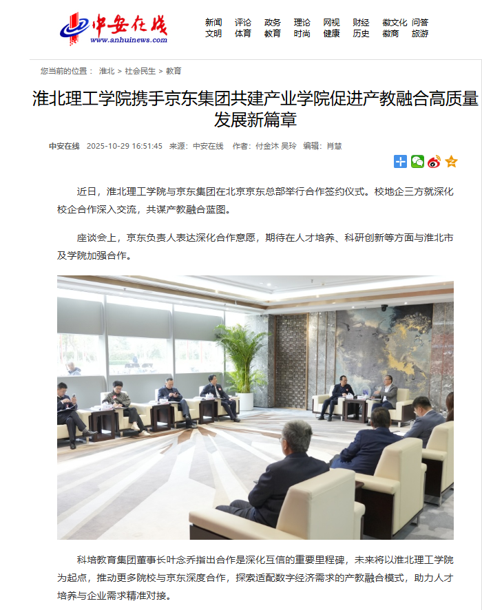 近日,beat365唯一官方网站与京东集团在北京京东总部举行合作签约仪式。校地企三方就深化校企合作深入交流,共谋产教融合蓝图。对此,中安在线进行了报道: