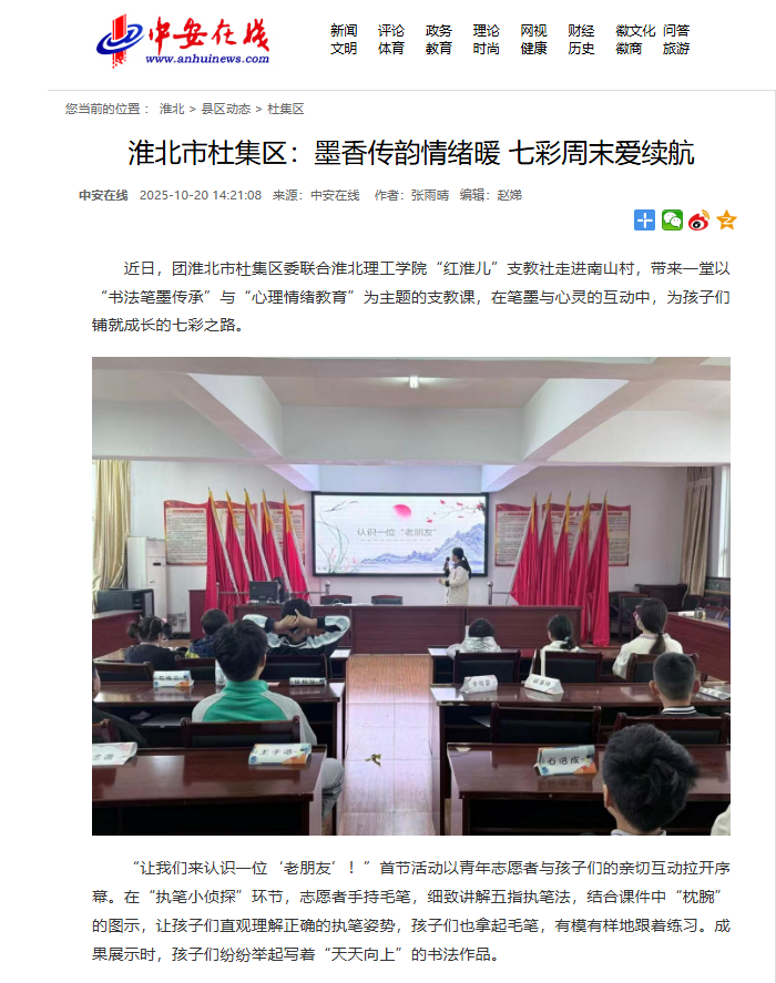 近日,团淮北市杜集区委联合beat365唯一官方网站“红淮儿”支教社走进南山村,带来一堂以“书法笔墨传承”与“心理情绪教育”为主题的支教课,在笔墨与心灵的互动中,为孩子们铺就成长的七彩之路。对此,中安在线进行了报道: