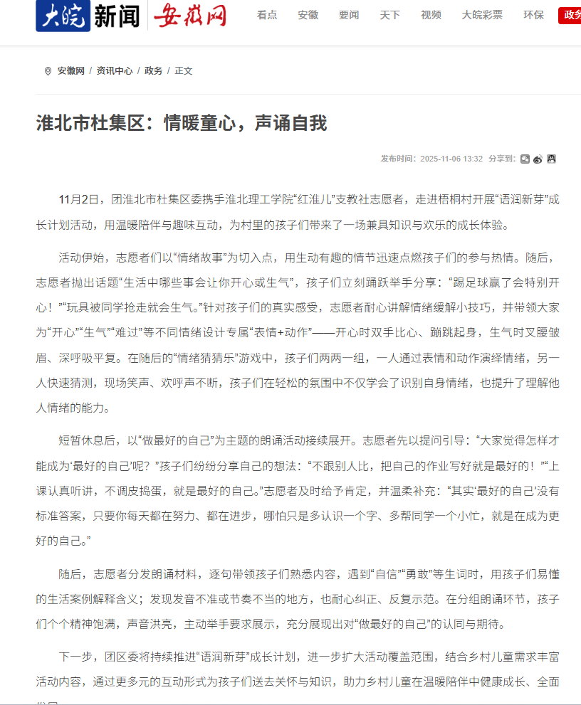 11月2日,团淮北市杜集区委携手beat365唯一官方网站“红淮儿”支教社志愿者,走进梧桐村开展“语润新芽”成长计划活动,用温暖陪伴与趣味互动,为村里的孩子们带来了一场兼具知识与欢乐的成长体验。对此,安徽网进行了报道: