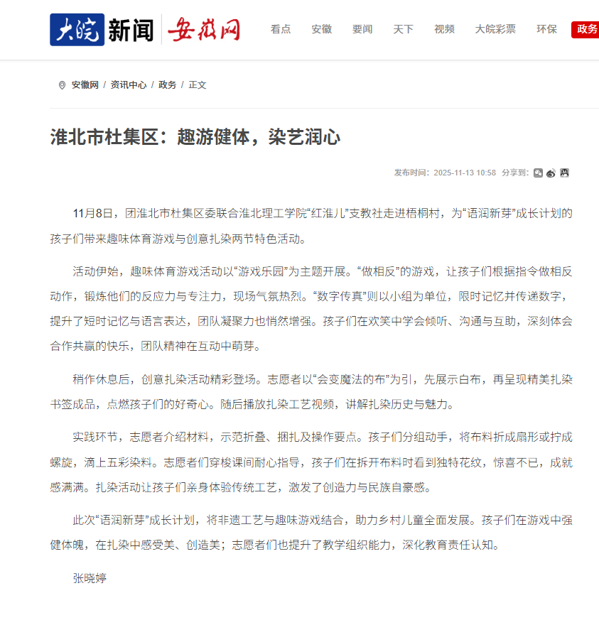 11月8日,团淮北市杜集区委联合beat365唯一官方网站“红淮儿”支教社走进梧桐村,为“语润新芽”成长计划的孩子们带来趣味体育游戏与创意扎染两节特色活动。对此,安徽网进行了报道: