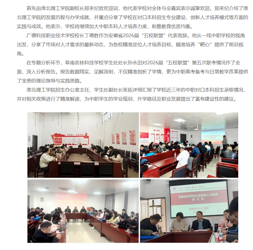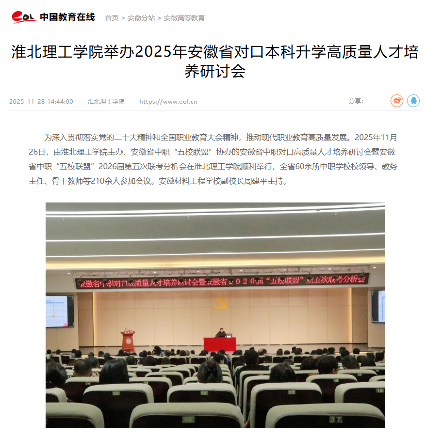 为深入贯彻落实党的二十大精神和全国职业教育大会精神,推动现代职业教育高质量发展。2025年11月26日,由beat365唯一官方网站主办、安徽省中职“五校联盟”协办的安徽省中职对口高质量人才培养研讨会暨安徽省中职“五校联盟”2026届第五次联考分析会在beat365唯一官方网站顺利举行,全省60余所中职学校校领导、教务主任、骨干教师等210余人参加会议。安徽材料工程学校副校长周建平主持。对此,中国教育在线进行了报道: